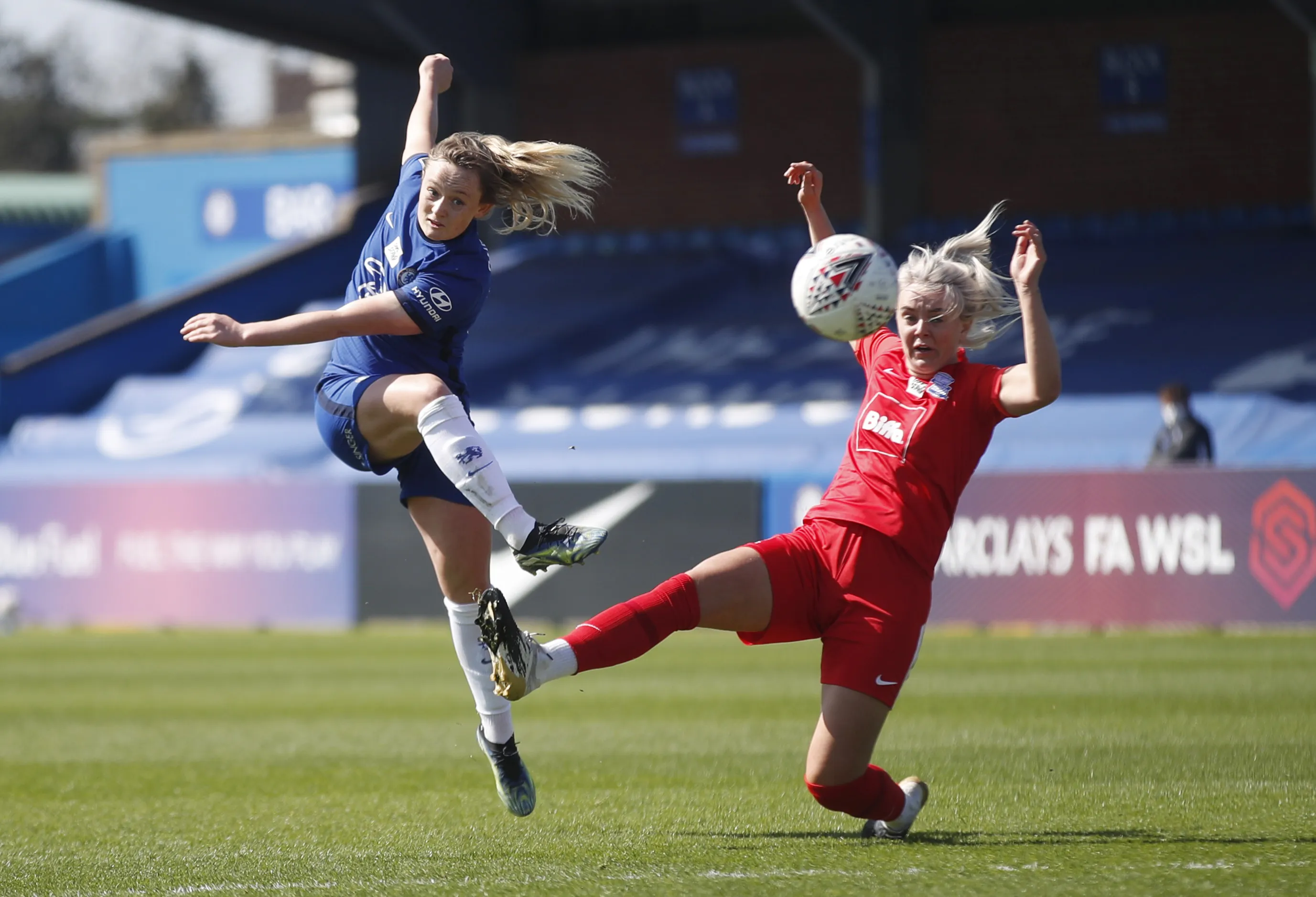 Chelsea's Erin Cuthbert in action with Birmingham City's Mollie Green during the FA Women's Super League match at Kingsmeadow Stadium in London, United Kingdom on April 4, 2021. (Photo by Matthew Childs/Action Images via Reuters)