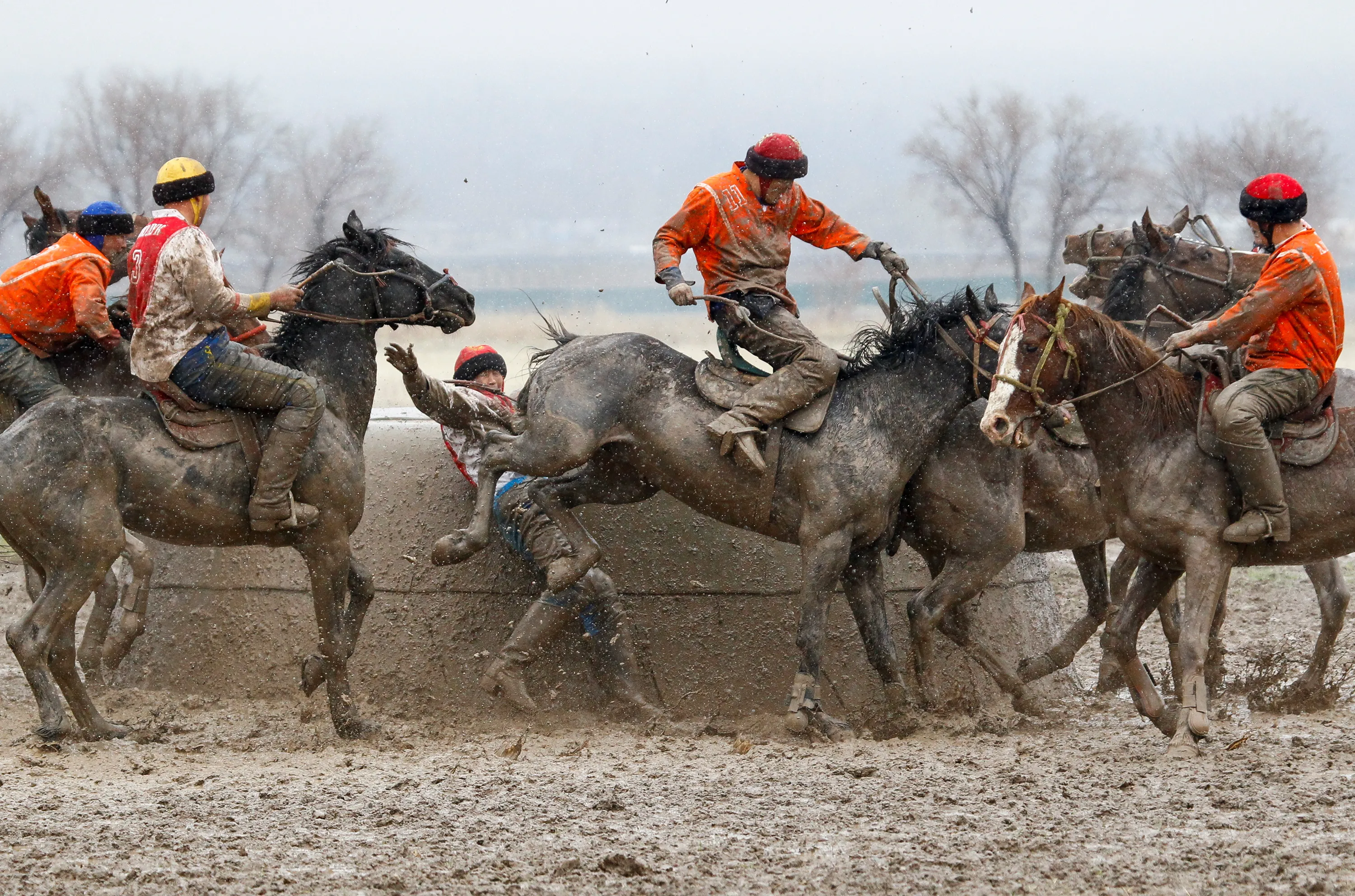 Kyrgyz riders take part in a Kok-Boru regional competition in the village of Sokuluk in Chui Region, Kyrgyzstan March 30, 2021. Kok-Boru is a traditional Central Asian game similar to polo, in which horsemen try to drop the headless carcass of a goat in an opponent's goal. (Photo by Vladimir Pirogov/Reuters)