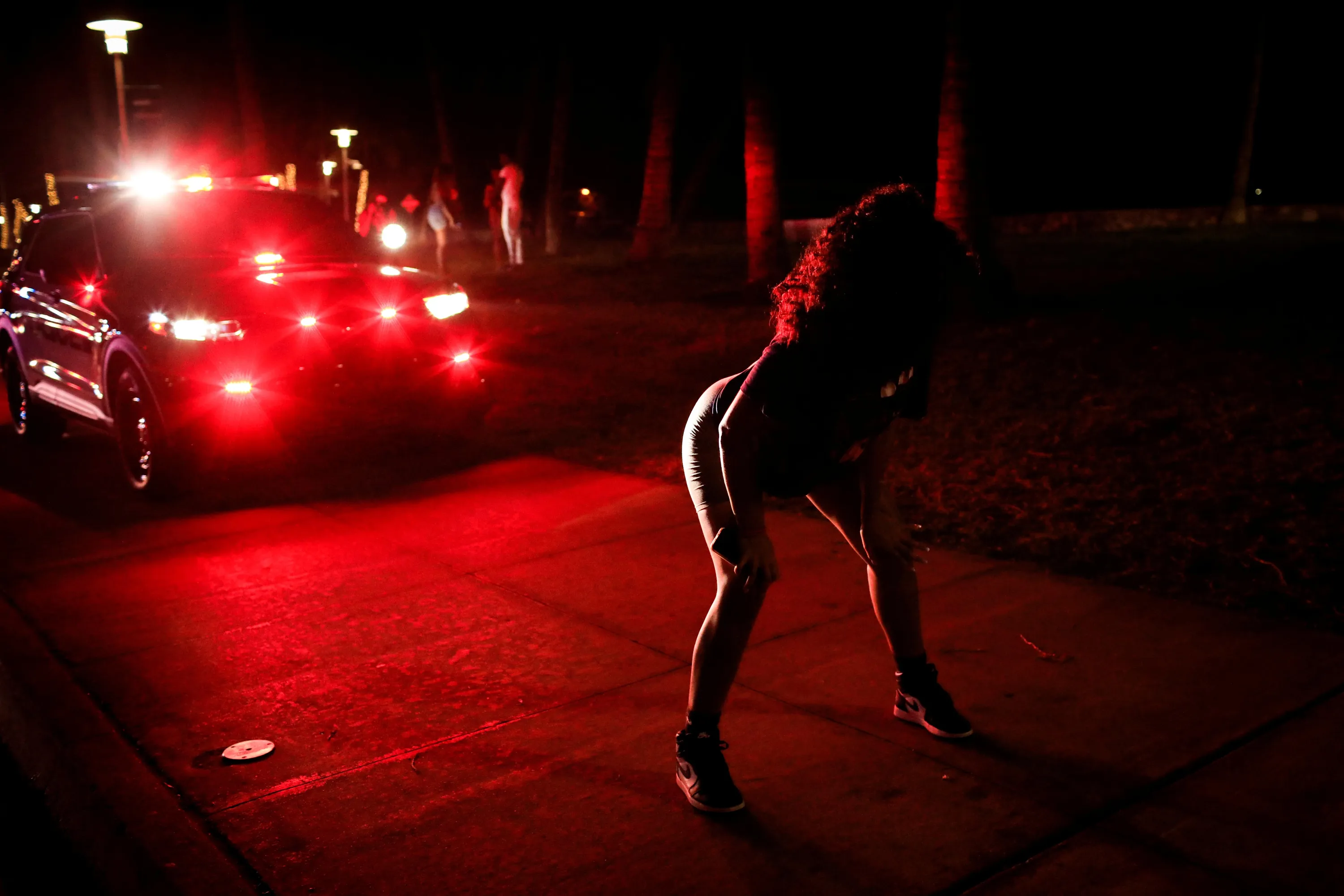 A woman dance in front of a patrol vehicle as police officers ask revelers to leave during an 8pm curfew imposed by local authorities on spring break festivities, amid the coronavirus disease (COVID-19) pandemic, in Miami Beach, Florida, U.S., March 26, 2021. (Photo by Marco Bello/Reuters)