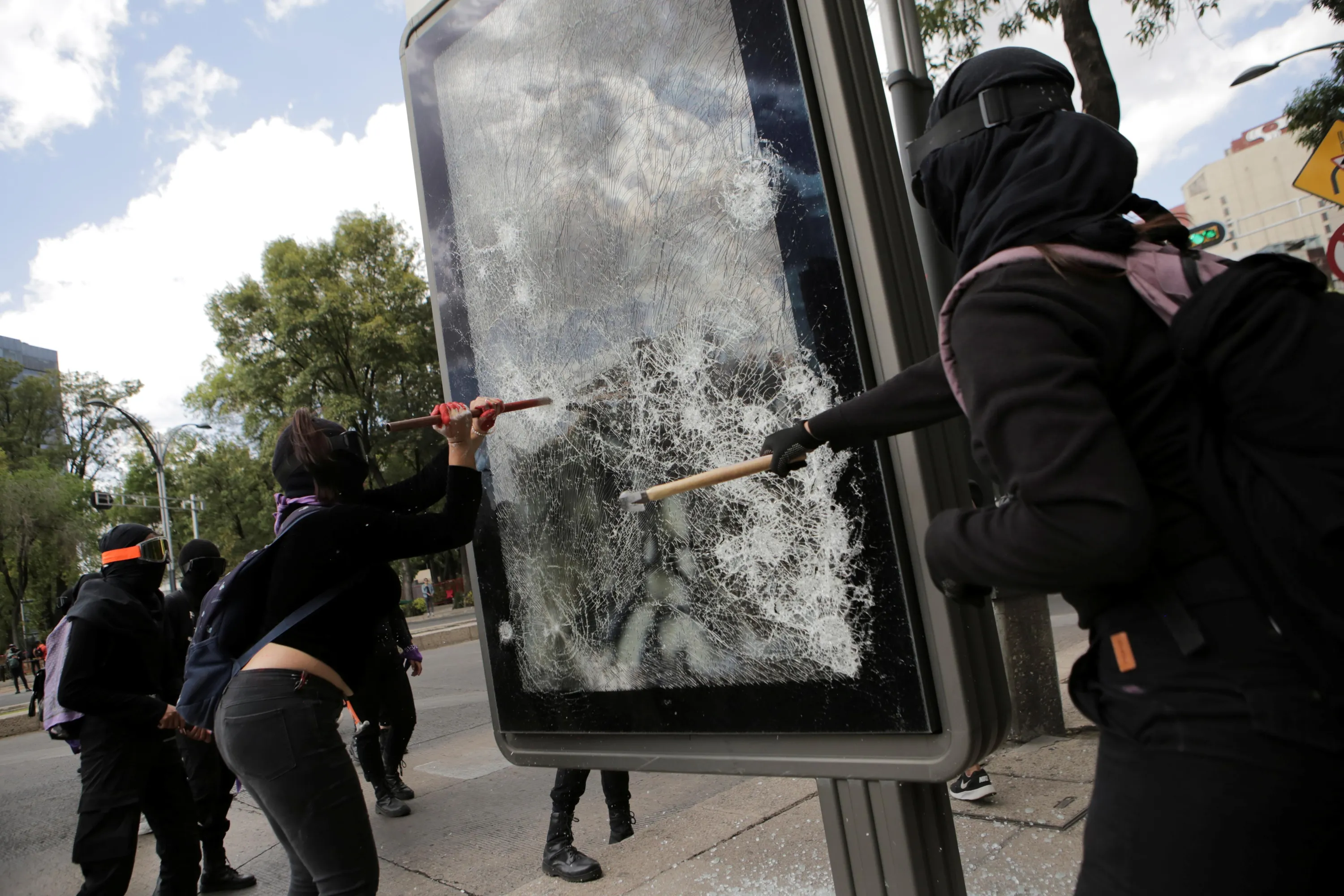 Demonstrators smash a billboard during a protest in support of Victoria Salazar, a Salvadoran woman who died after a Mexican female police officer was seen in a video kneeling on her back, in Mexico City, Mexico on April 2, 2021. (Photo by Raquel Cunha/Reuters)