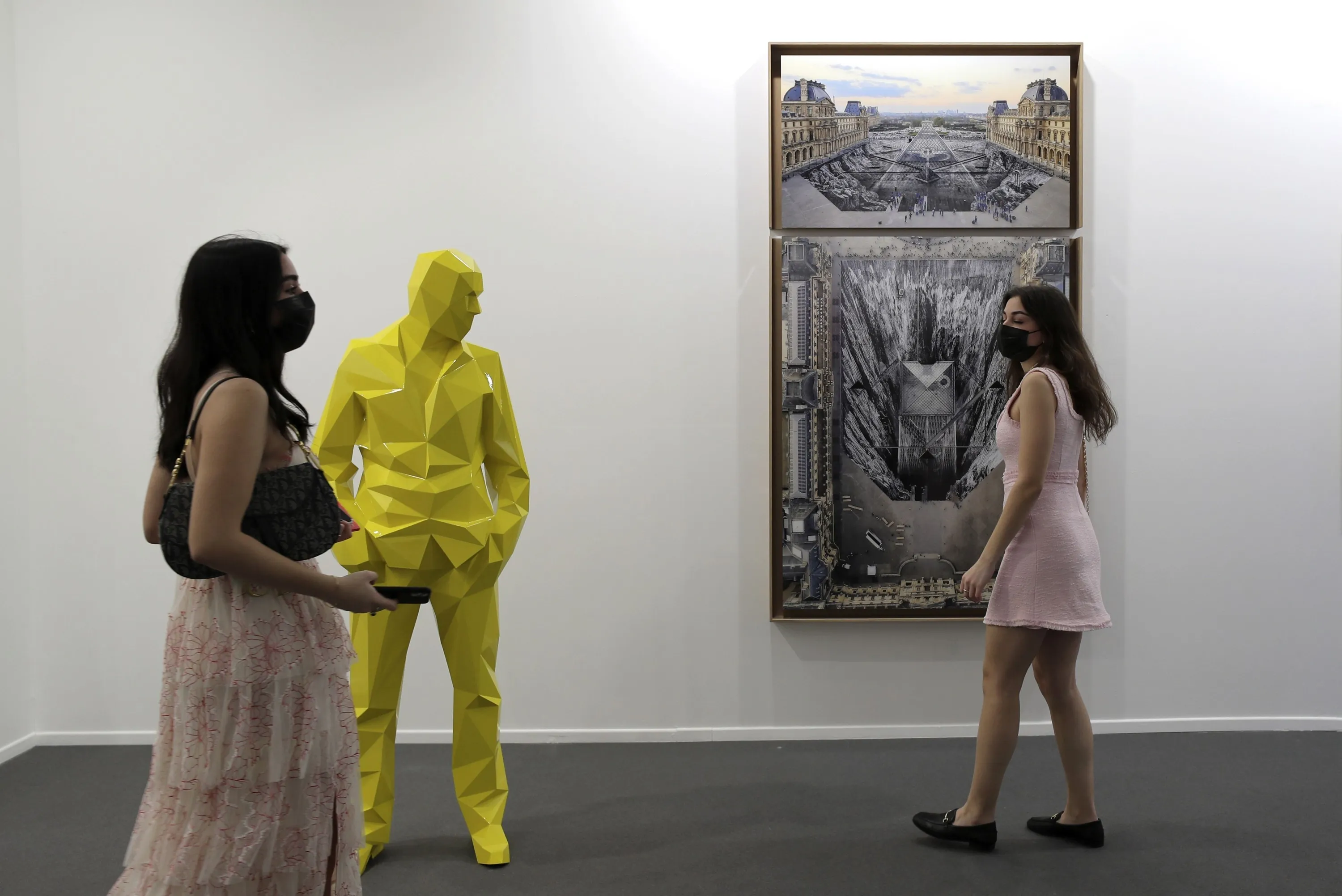 People visit Perrotin gallery of the 14th edition of Art Dubai at Dubai International Financial Centre, DIFC, which features 50 galleries from 31 countries with a focus on modern and contemporary art, in Dubai, United Arab Emirates, Tuesday, March 30, 2021. (Photo by Kamran Jebreili/AP Photo)