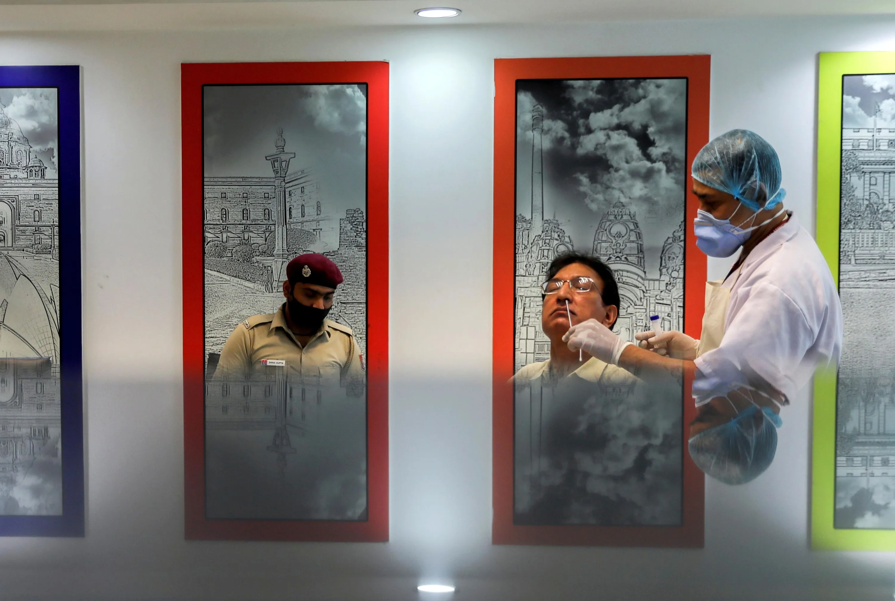 A healthcare worker wearing a protective face mask collects a swab sample from a man, amidst the spread of the coronavirus disease (COVID-19), in New Delhi, India, April 6, 2021. (Photo by Anushree Fadnavis/Reuters)