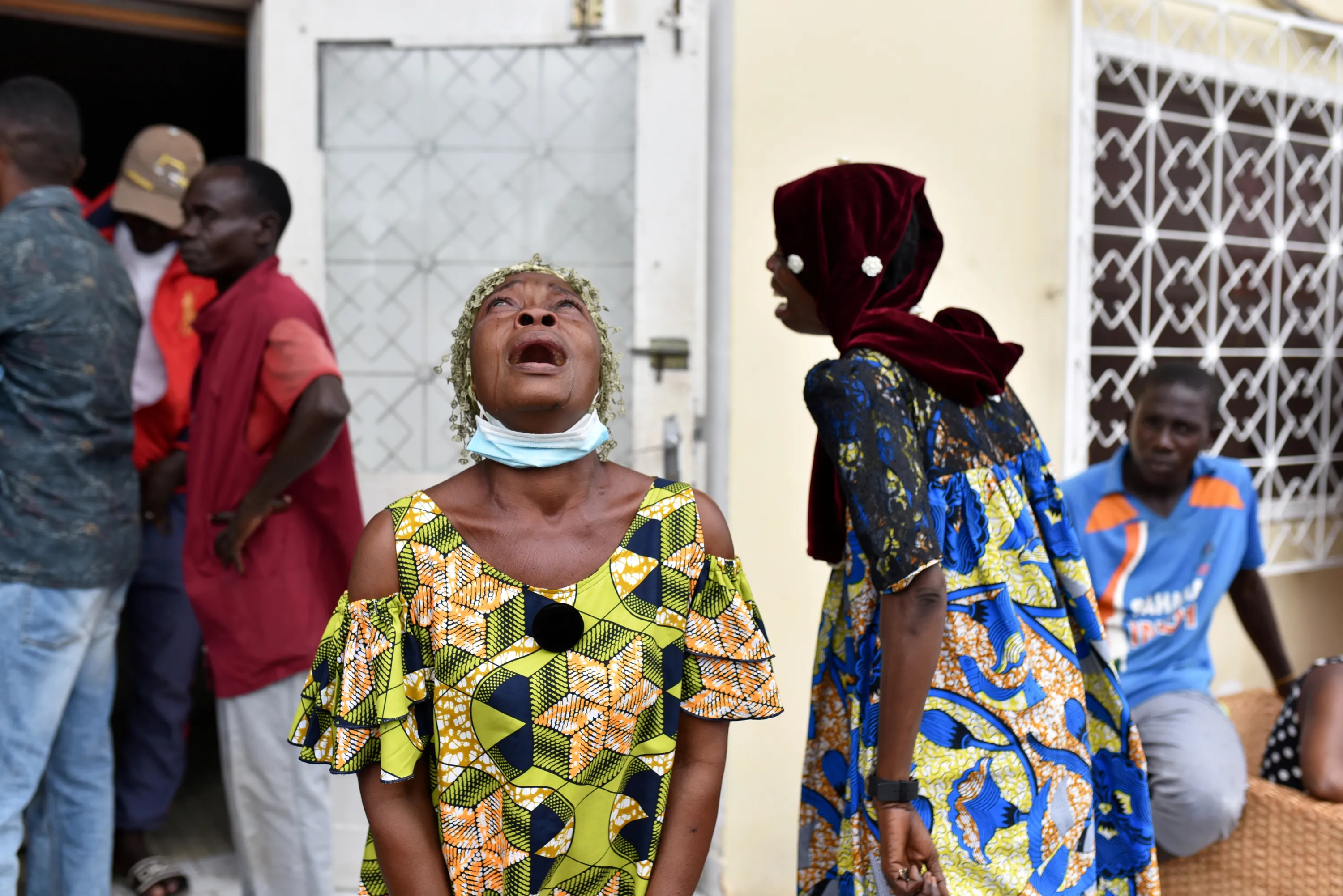 Women cry after Congo Republic's opposition presidential candidate Guy Brice Parfait Kolelas died from coronavirus disease (COVID-19) at the Union of Humanist Democrats offices in Brazzaville, Republic of Congo, March 22, 2021. (Photo by Olivia Acland/Reuters)