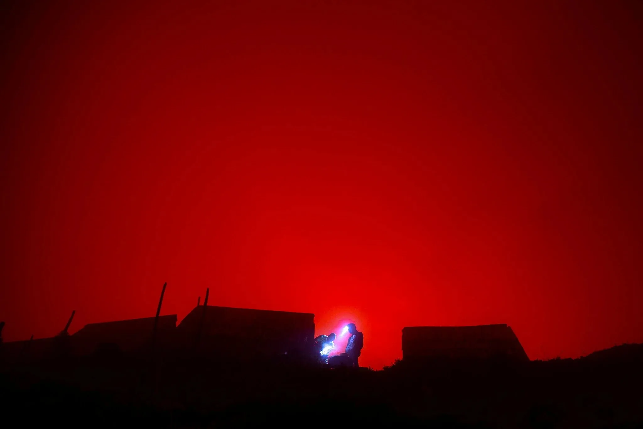 Congolese chefs cook on the rim of Nyiragongo volcano, lit up by the lava lake behind, inside the Virunga National Park near Goma, in the eastern Democratic Republic of Congo February 11, 2021. Analysts say the crater of Mount Nyiragongo in the eastern Democratic Republic of Congo has refilled with magma, raising the crater floor and fears of an even bigger disaster if an earthquake were to cause a fracture in the flank of the volcano. (Photo by Hereward Holland/Reuters)