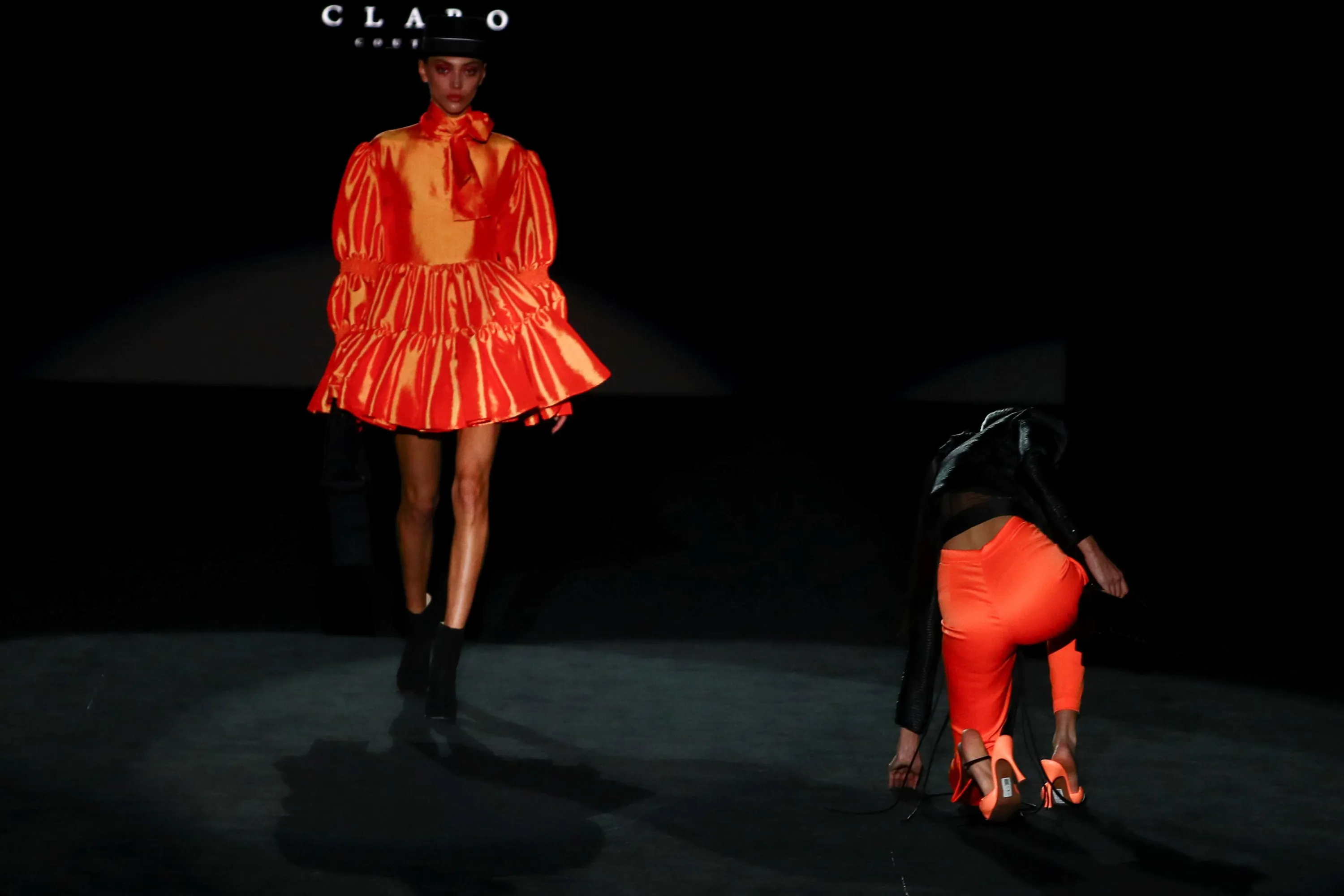 A model falls on the stage as she displays an outfit created by Fernando Claro during the Mercedes Benz Fashion Week, amid the coronavirus disease (COVID-19) outbreak, in Madrid, Spain, April 8, 2021. (Photo by Sergio Perez/Reuters)
