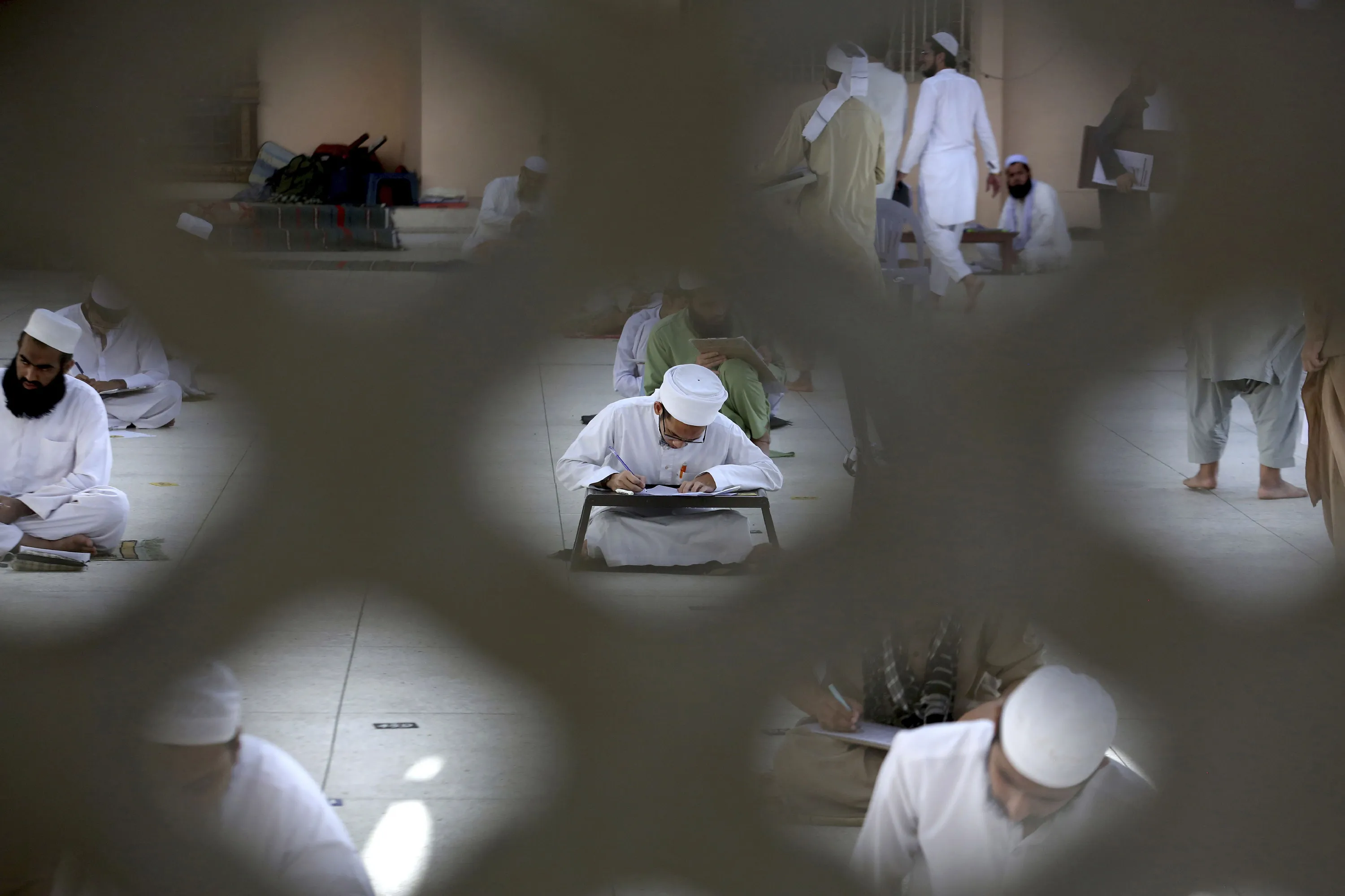 Religious students take their annual exams sitting on the floor of the Jamia Binoria Islamic seminary in Karachi, Pakistan, Saturday, March 13, 2021. Binoria is one of the model seminaries which modified its curriculum and added contemporary subjects like computer, mathematics and science. (Photo by Fareed Khan/AP Photo)