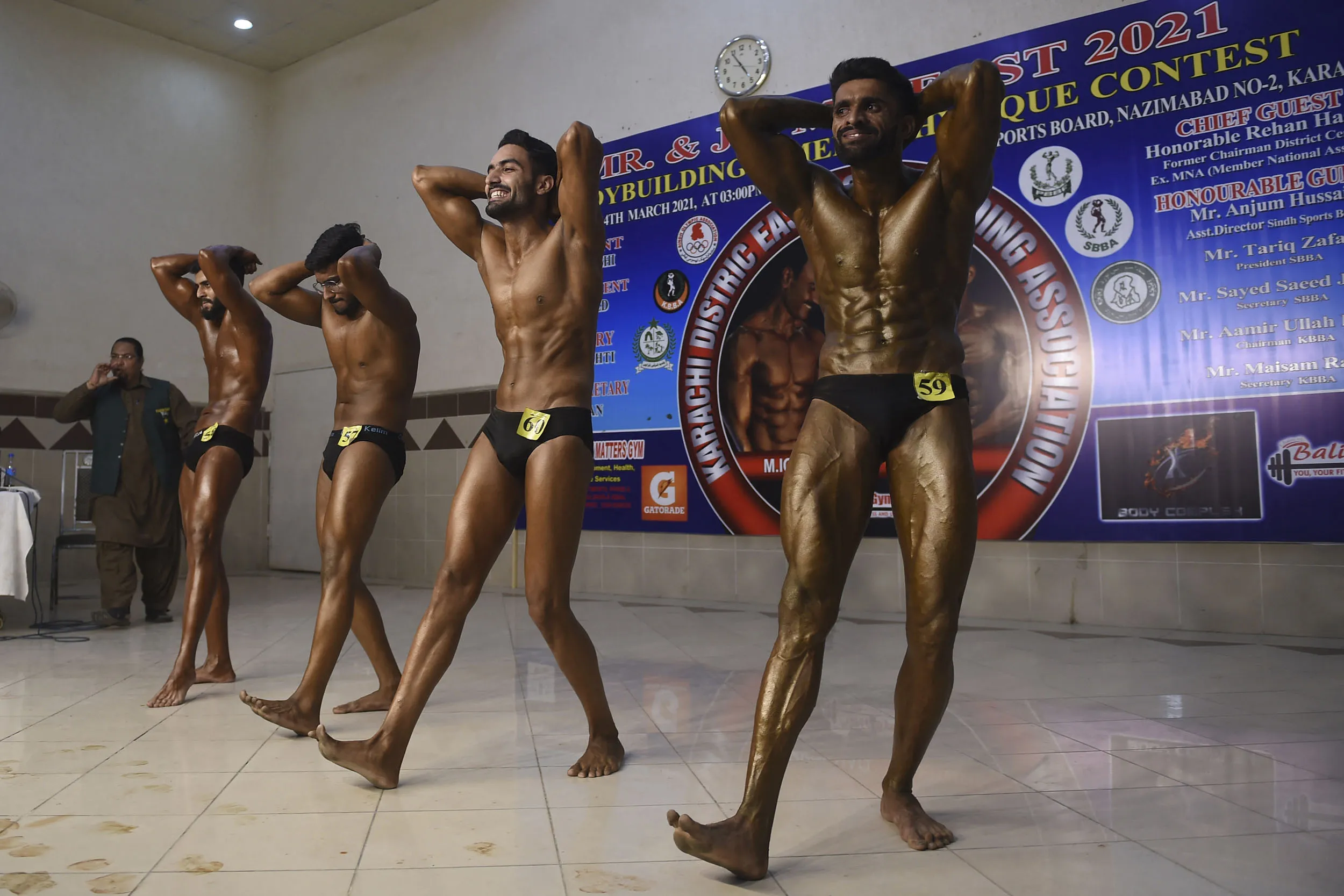 Bodybuilders flex their muscles during a bodybuilding competition in Karachi on March 14, 2021. (Photo by Rizwan Tabassum/AFP Photo)