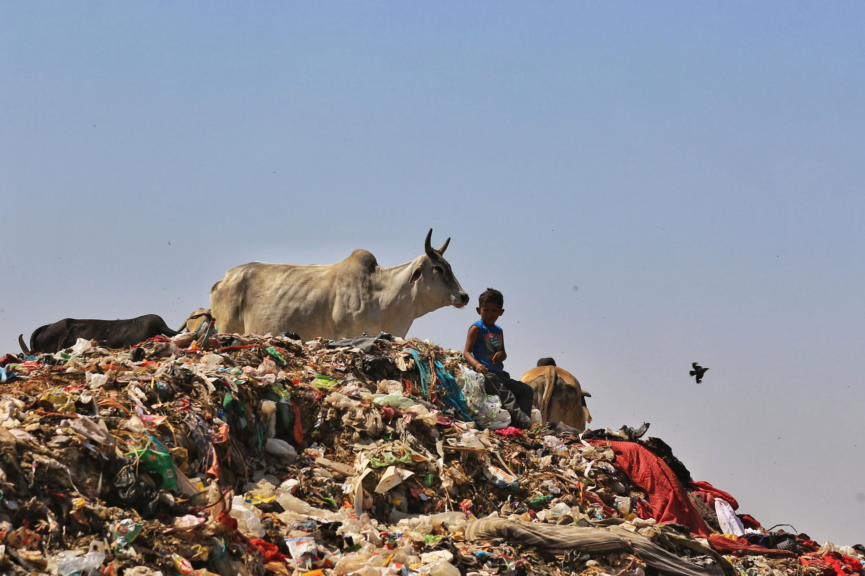 A boy sit in a heap of garbage, at Sevapura dumping yard in Jaipur,Rajasthan, India, Wednesday, April 07, 2021. (Photo by Vishal Bhatnagar/NurPhoto/Rex Features/Shutterstock)