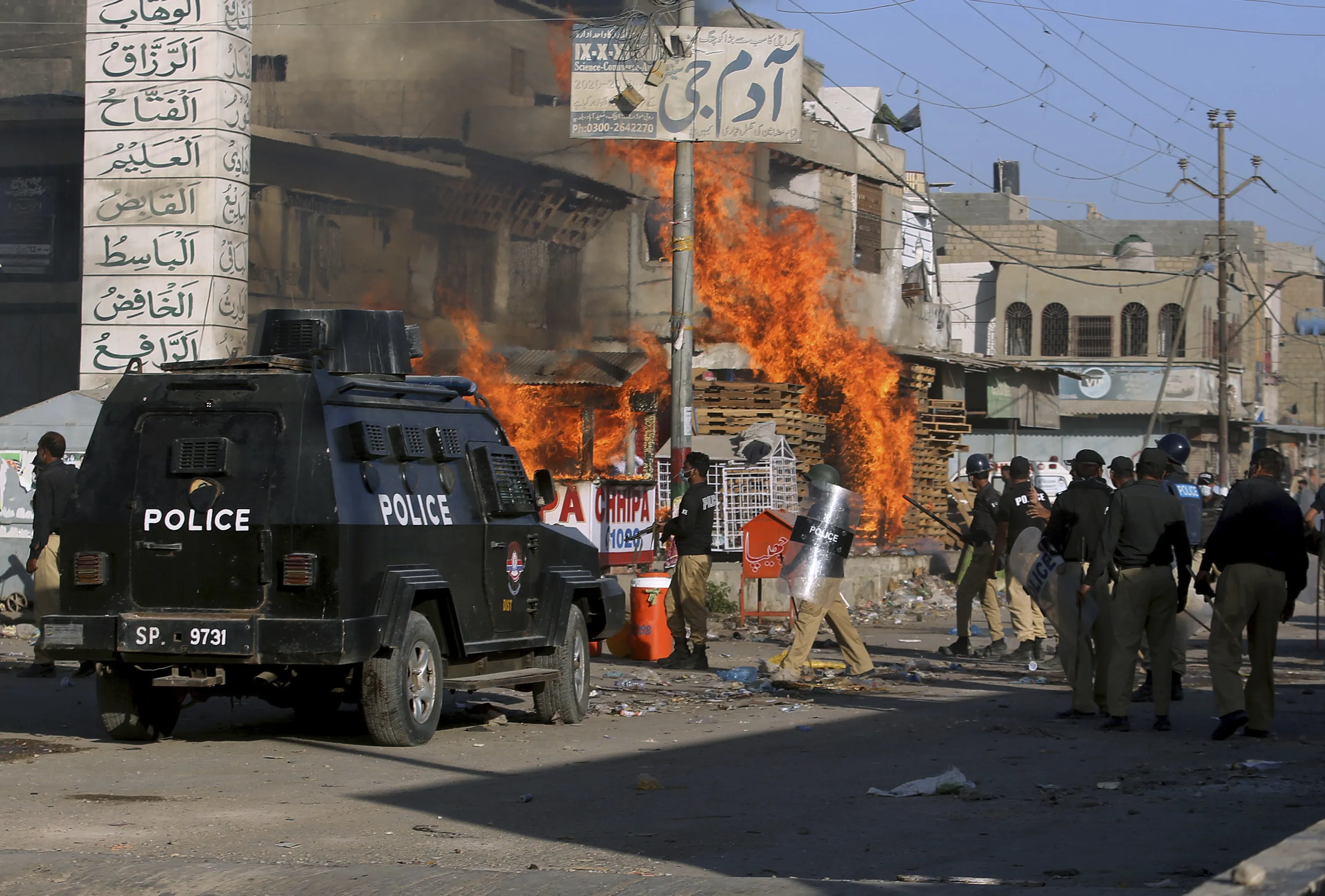 Police officers arrive to confront angry supporters of Tehreek-e-Labiak Pakistan, a radical Islamist political party, who set fires during protests following the arrest of their party leader Saad Rizvi, in Karachi, Pakistan, Tuesday, April 13, 2021. (Photo by Fareed Khan/AP Photo)