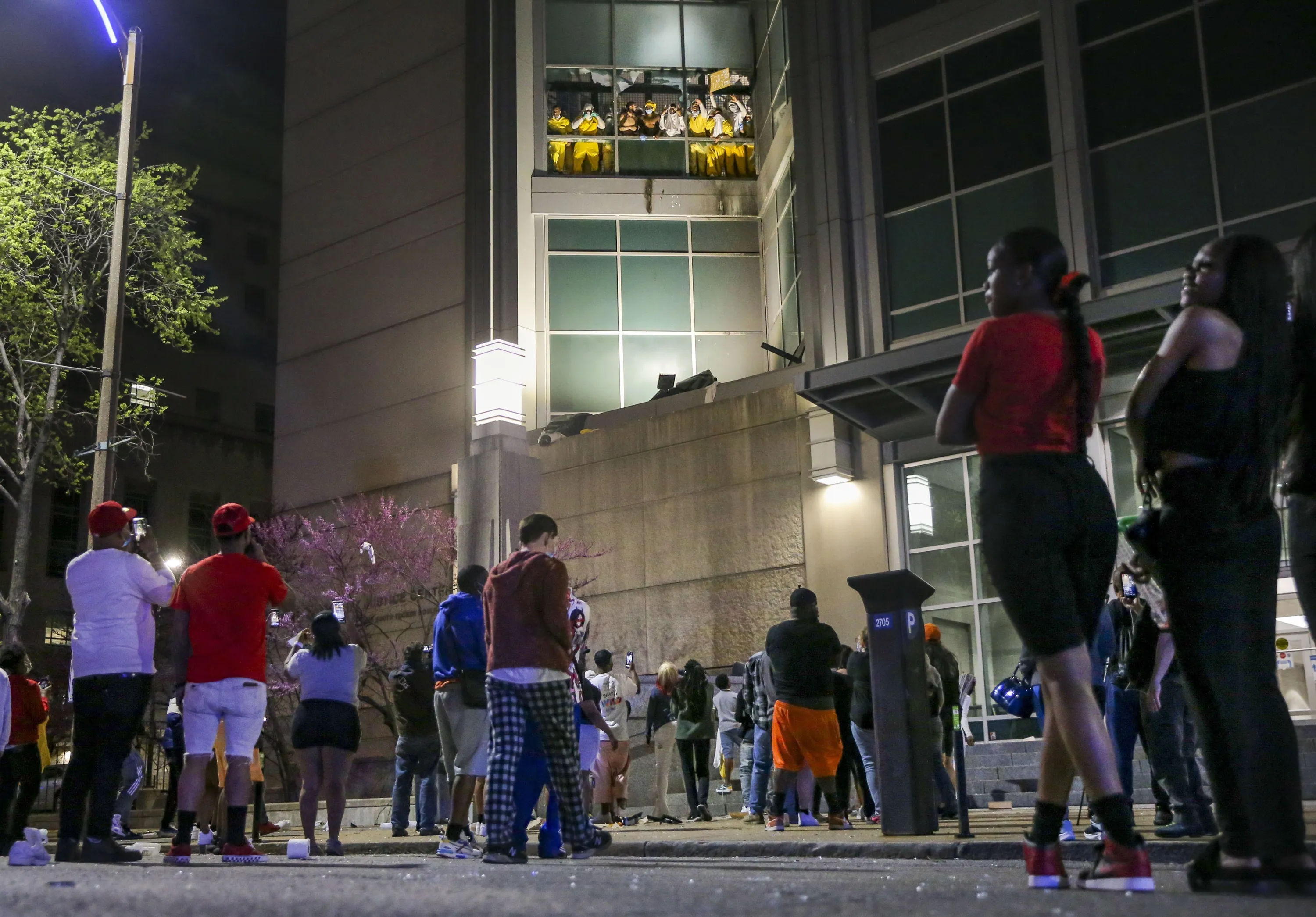 Onlookers watch from the street as inmates chant and throw things from broken windows at the St. Louis Justice Center, known as the city jail, on Sunday, April 4, 2021. (Photo by Colter Peterson/St. Louis Post-Dispatch via AP Photo)