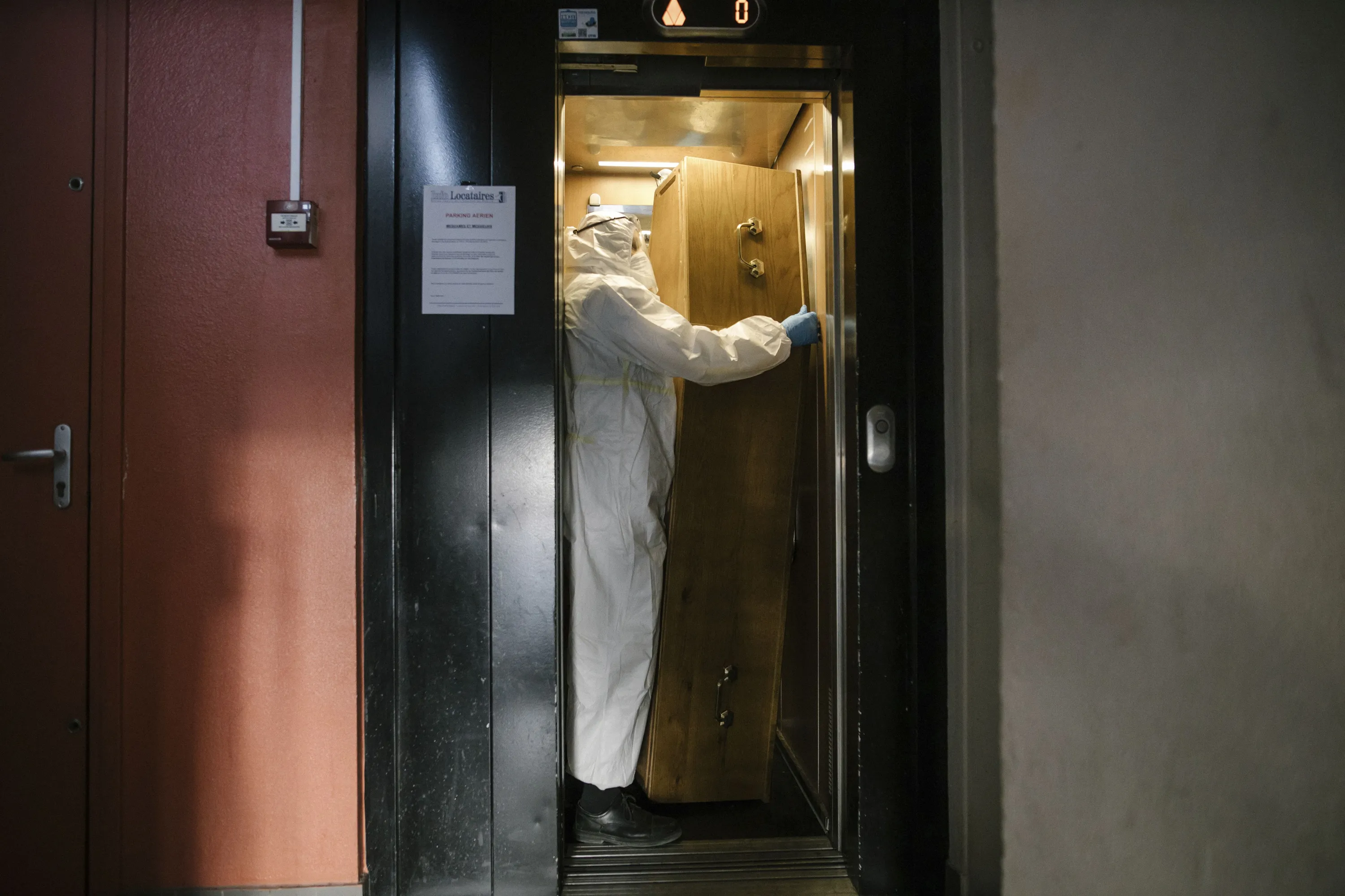 In this image released by World Press Photo, Thursday April 15, 2021, by Laurence Geai, part of a series titled Pandemic in France, which won the third prize in the General News Stories category, shows A morgue employee transports a coffin from the fifth floor of an apartment block, in the Parisian suburb of Pantin, on April 23, 2020. (Photo by Laurence Geai, World Press Photo via AP Photo)