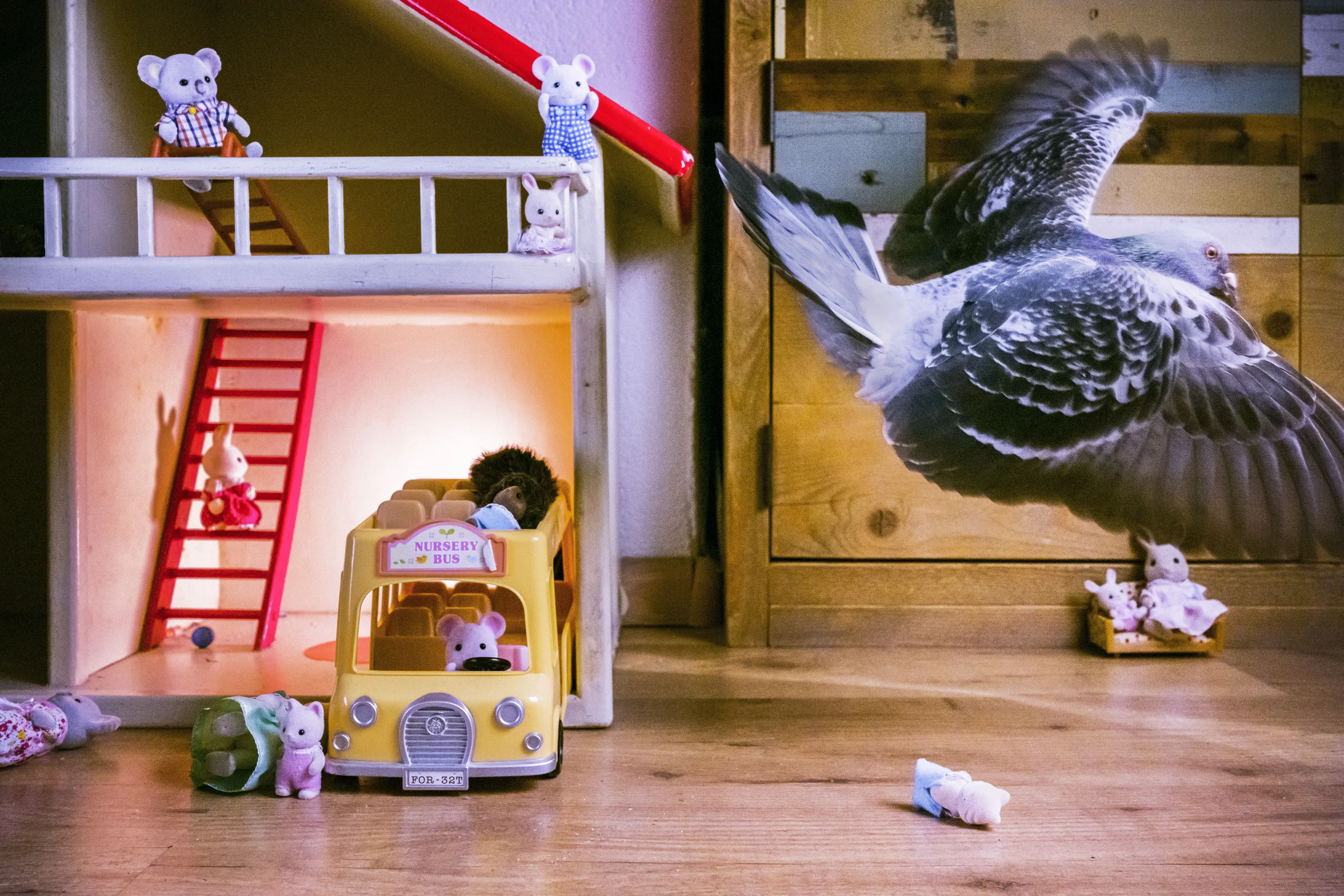 In this image released by World Press Photo, Thursday April 15, 2021, by Jasper Doest, part of a series titled Pandemic Pigeons – A Love Story, which won first prize in the Nature Stories category, shows Ollie flies through the living room, after knocking over toys, in Vlaardingen, the Netherlands, on 30 April 2020. (Photo by Jasper Doest, World Press Photo via AP Photo)