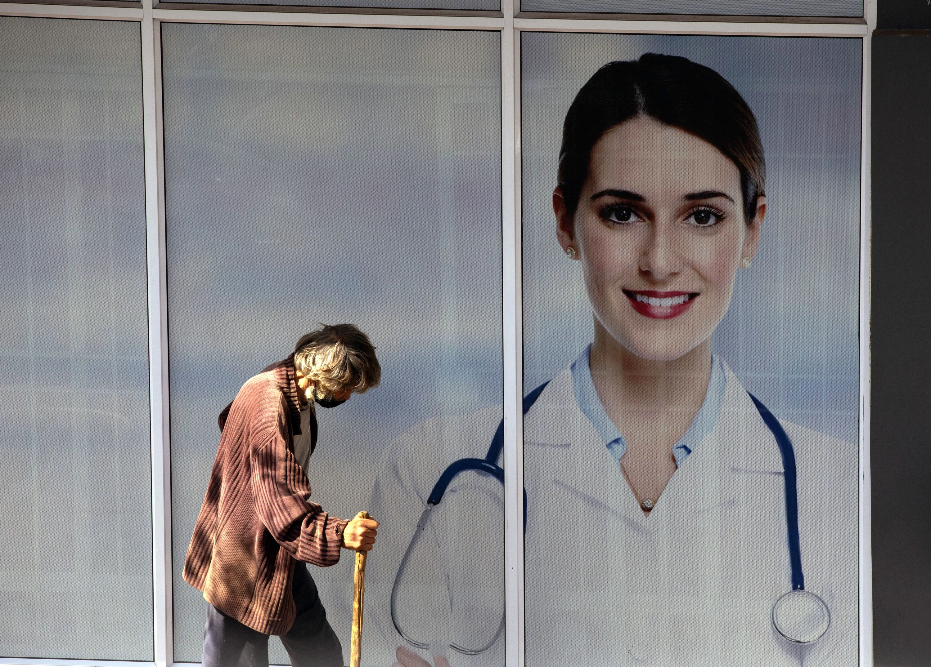 A man passes doctors consulting rooms in Johannesburg Friday, April 16, 2021. South Africa took the first step to launch online registrations for the vaccination of people who are 60 years and older as it prepares for the second phase of its vaccination programme expected to start next month. (Photo by Denis Farrell/AP Photo)