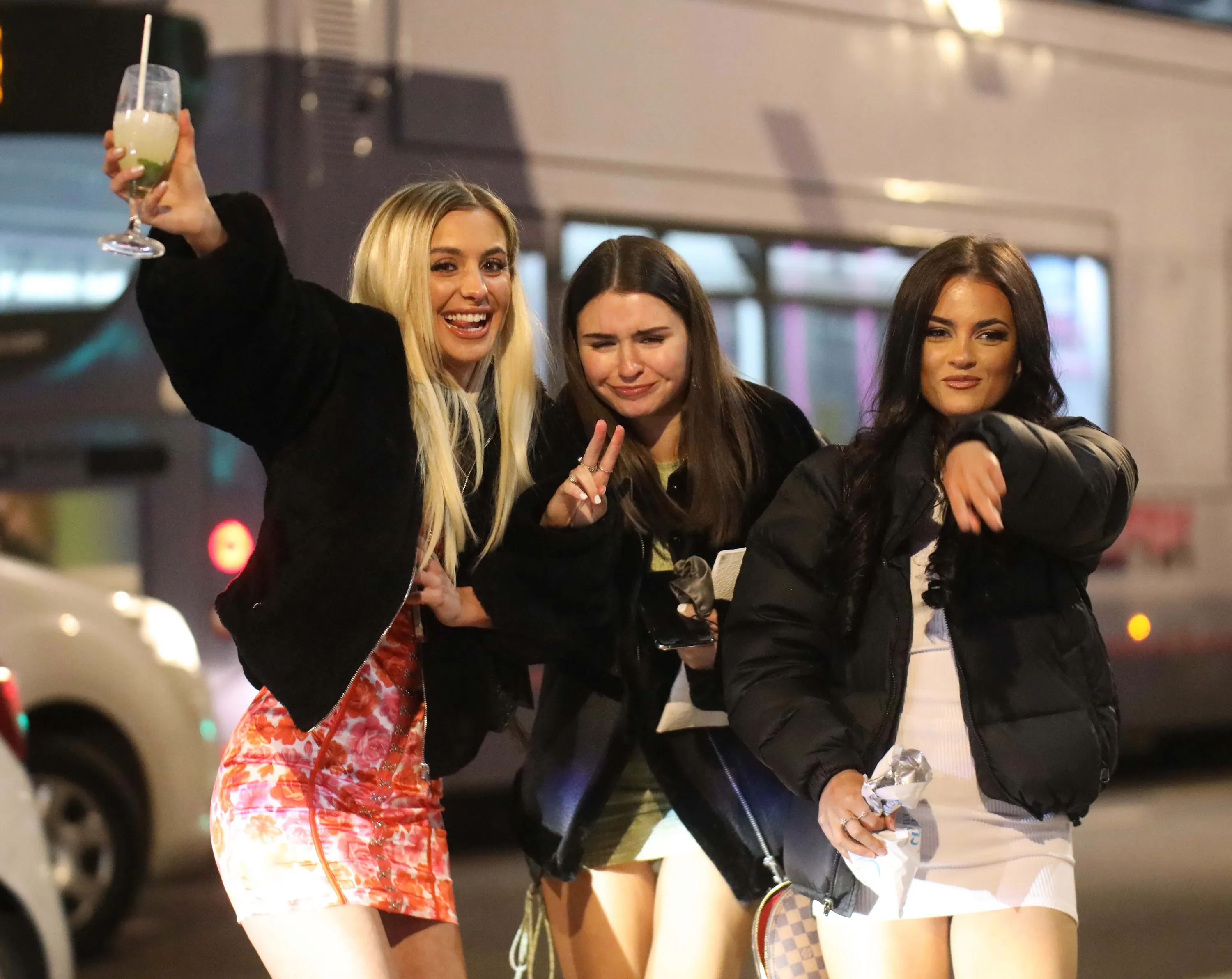 Pals are seen on a night out in Leeds, United Kingdom on April 16, 2021. Pubs and Restaurants are expecting good business tonight being the first Friday night after Coronavirus lockdown rules were relaxed to allow outside dining and drinking. (Photo by Nb press ltd)