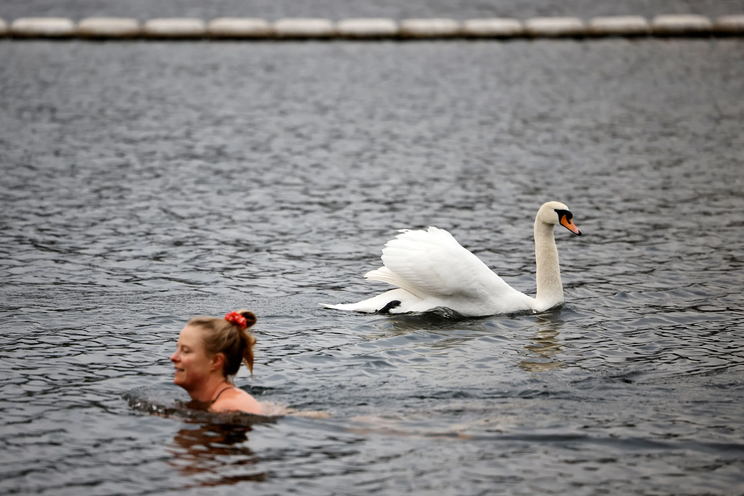 A bather swims past a swan in the Serpentine Lido in Hyde Park, London as England's third Covid-19 lockdown restrictions ease, allowing outdoor sports facilities to open on March 29, 2021. England began to further ease its coronavirus lockdown on Monday, spurred by rapid vaccinations, but governments in the rest of Europe struggled to contain Covid-19 surges. (Photo by Tolga Akmen/AFP Photo)