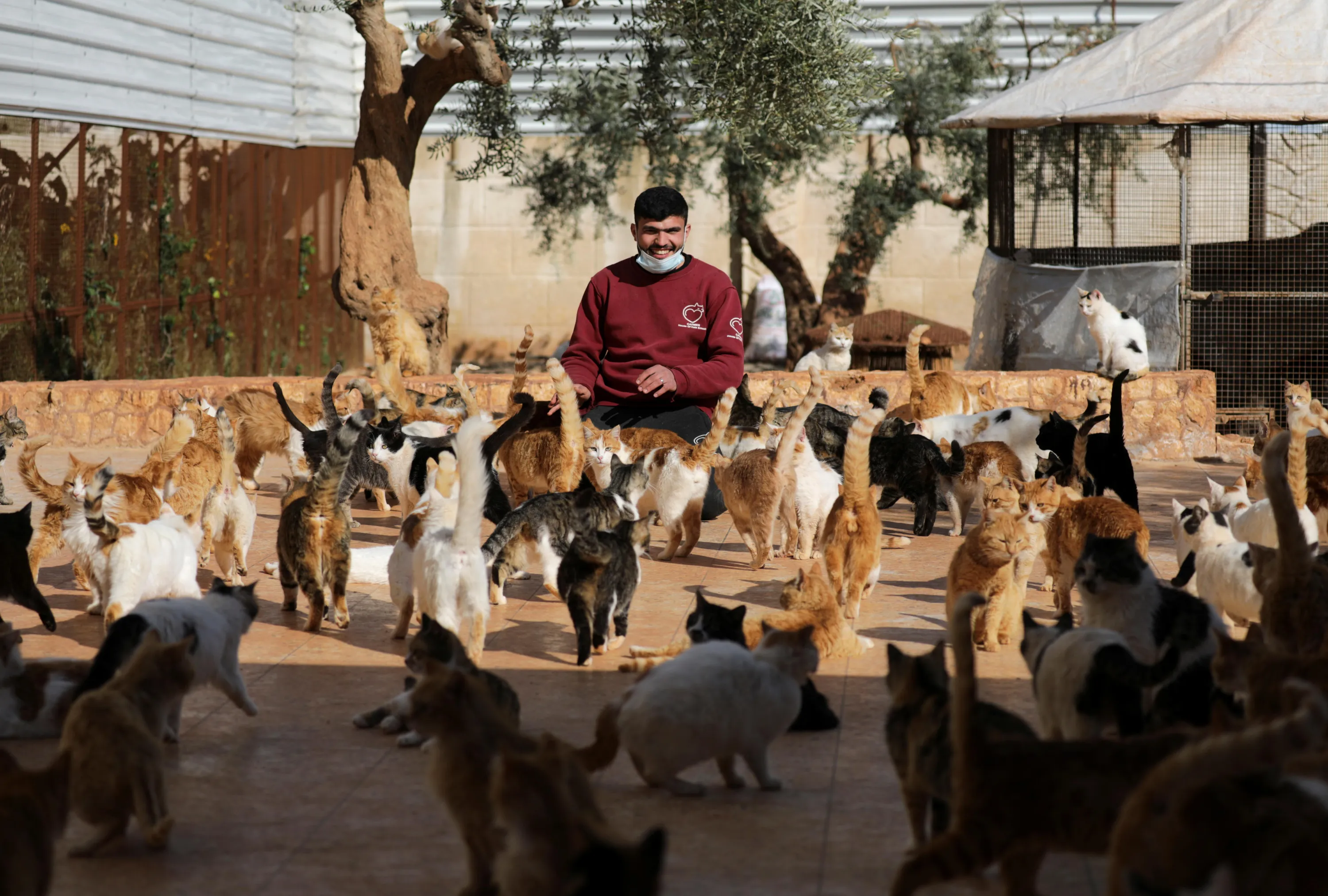 A worker plays with cats at Ernesto's sanctuary for cats in Idlib, Syria March 28, 2021. The shelter cares for more than 1,000 cats left behind by families fleeing the war. (Photo by Khalil Ashawi/Reuters)