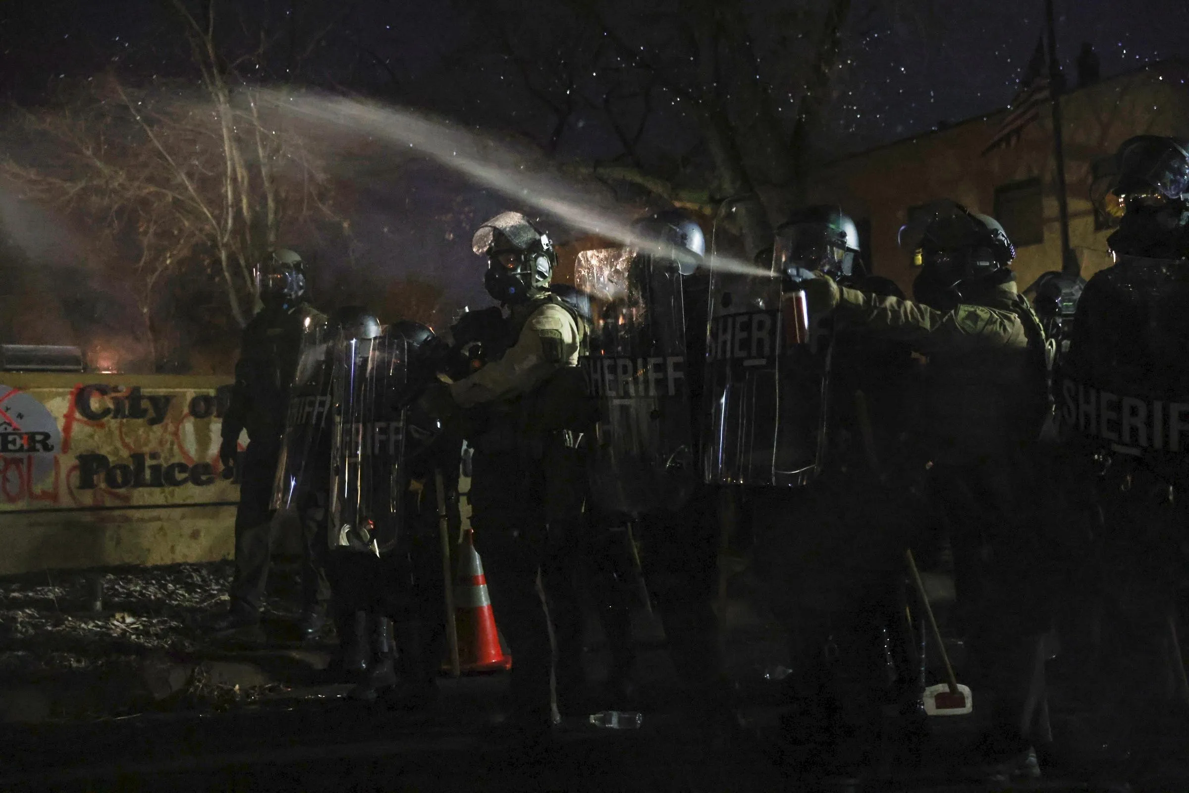 A police officer releases a chemical irritant at a protester on the other side of the fence of the Brooklyn Center Police Department, in Brooklyn Center, Minnesota, April 13, 2021. (Photo by Leah Millis/Reuters)