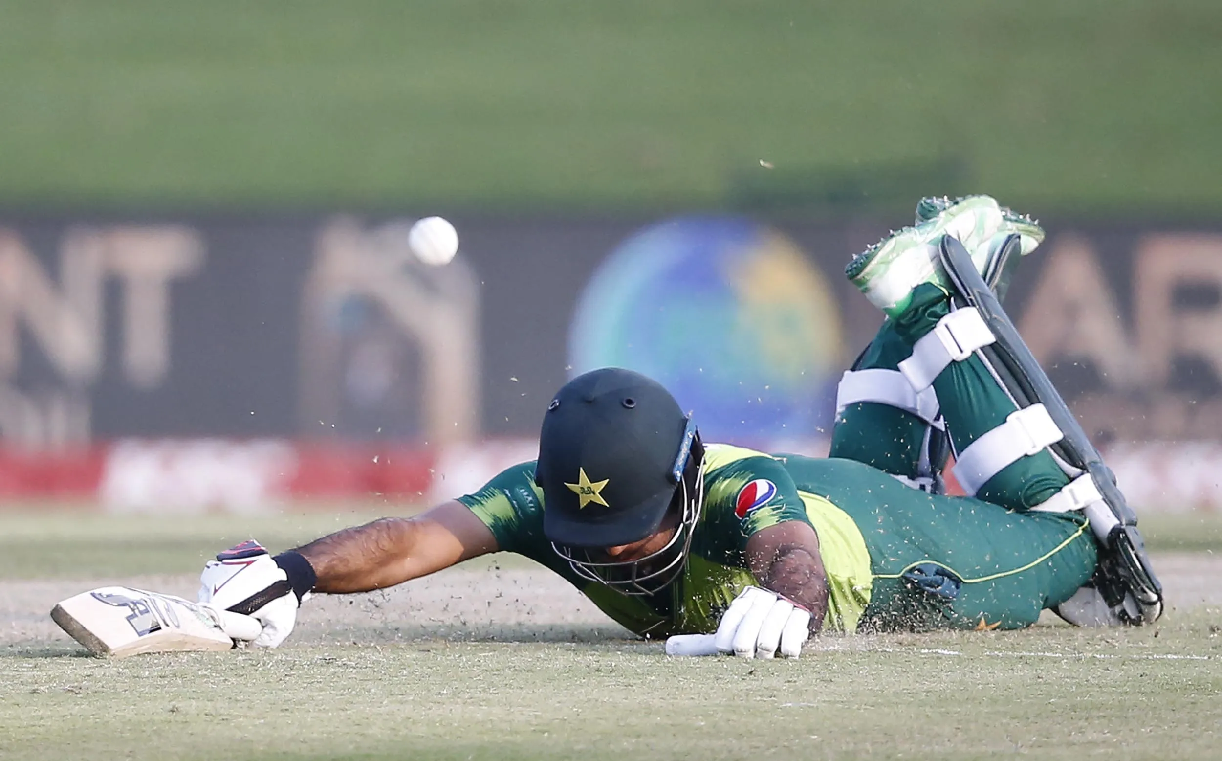 Pakistan's Fakhar Zaman dives to make his crease during the fourth Twenty20 international cricket match between South Africa and Pakistan at SuperSport Park in Centurion on April 16, 2021. (Photo by Phill Magakoe/AFP Photo)