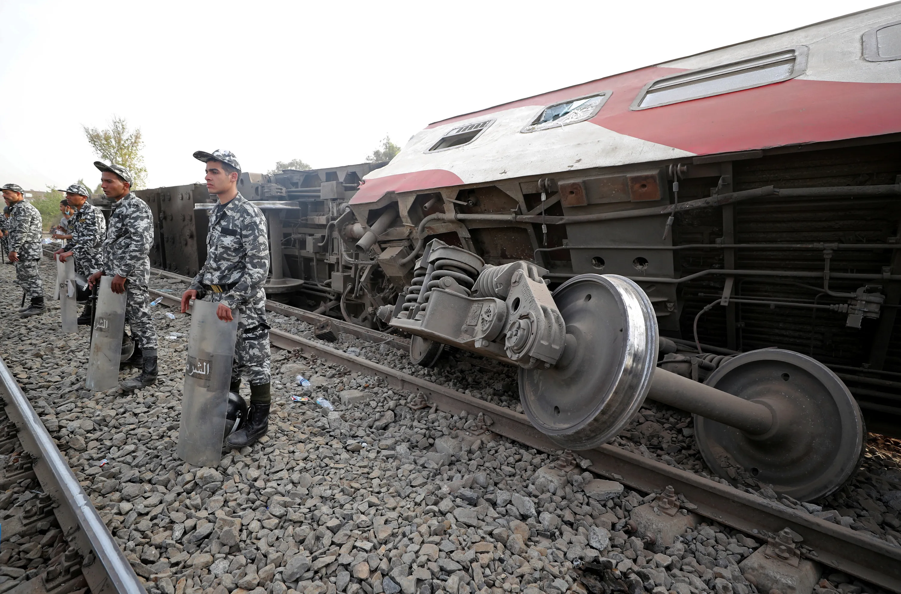 Egyptian police officers stand guard at the site where train carriages derailed in Qalioubia province, north of Cairo, Egypt April 18, 2021. (Photo by Mohamed Abd El Ghany/Reuters)
