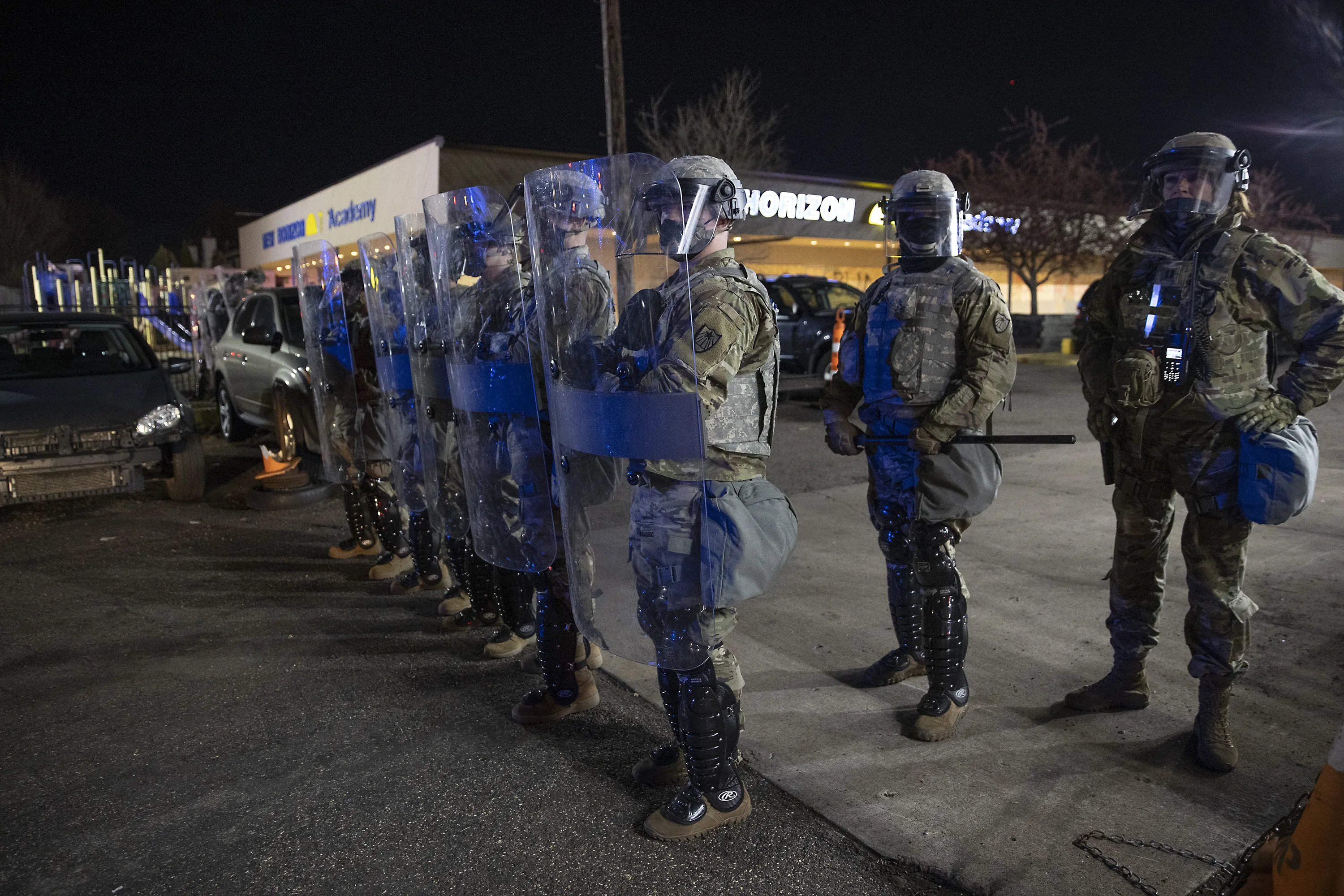 Protestors gather in front of the Brooklyn Center Police Department, Friday, April 16, 2021 in Brooklyn Center, Minn. Former Brooklyn Center police Officer Kim Potter was charged with second-degree manslaughter in Sunday's shooting of Daunte Wright, a 20-year-old Black man, during a traffic stop. (Photo by Elizabeth Flores/Star Tribune via AP Photo)