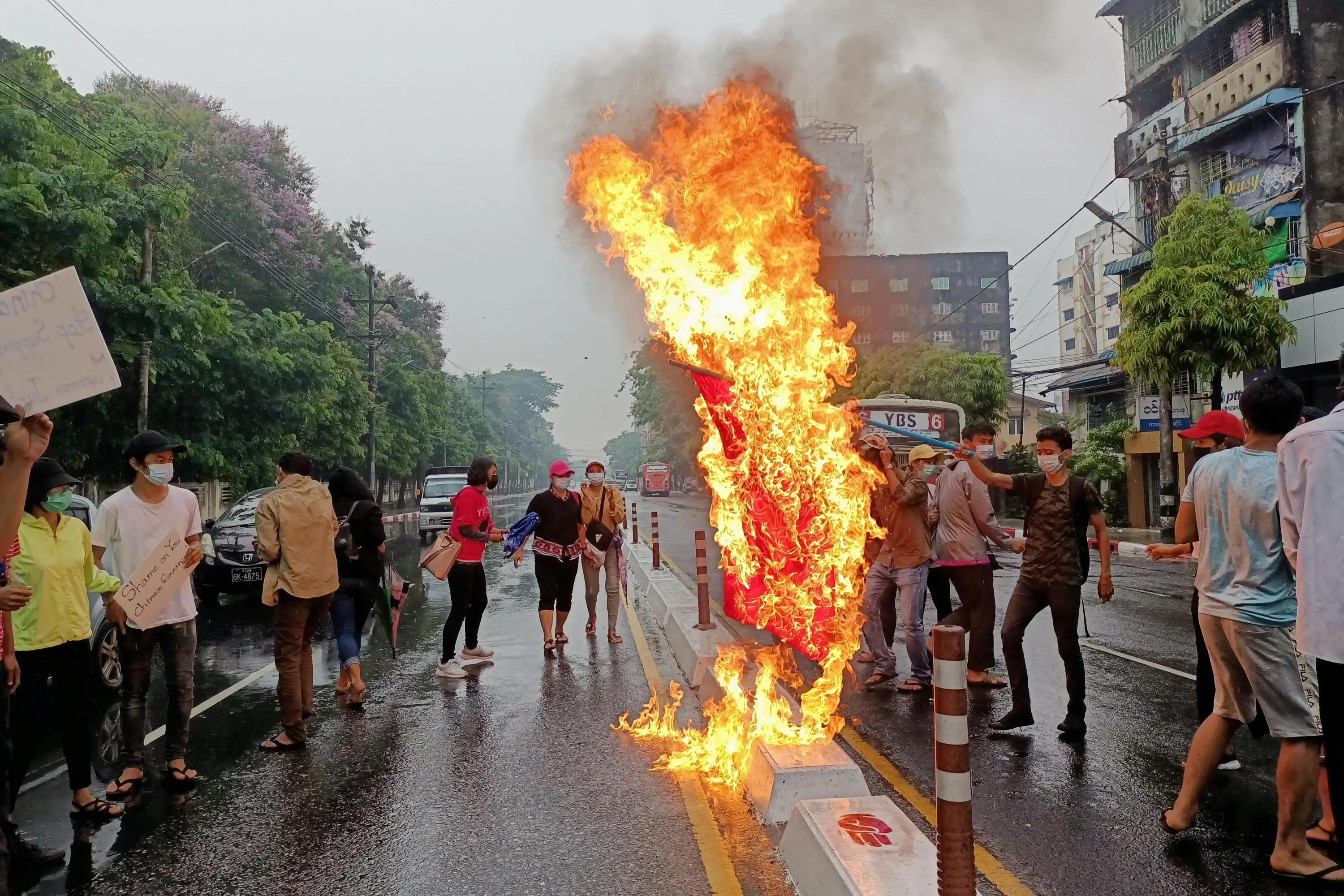 Anti-coup protesters burn a Chinese national flag during a demonstration against Beijing’s support for the Myanmar military in Yangon, Myanmar on April 5, 2021. (Photo by Reuters/Stringer)