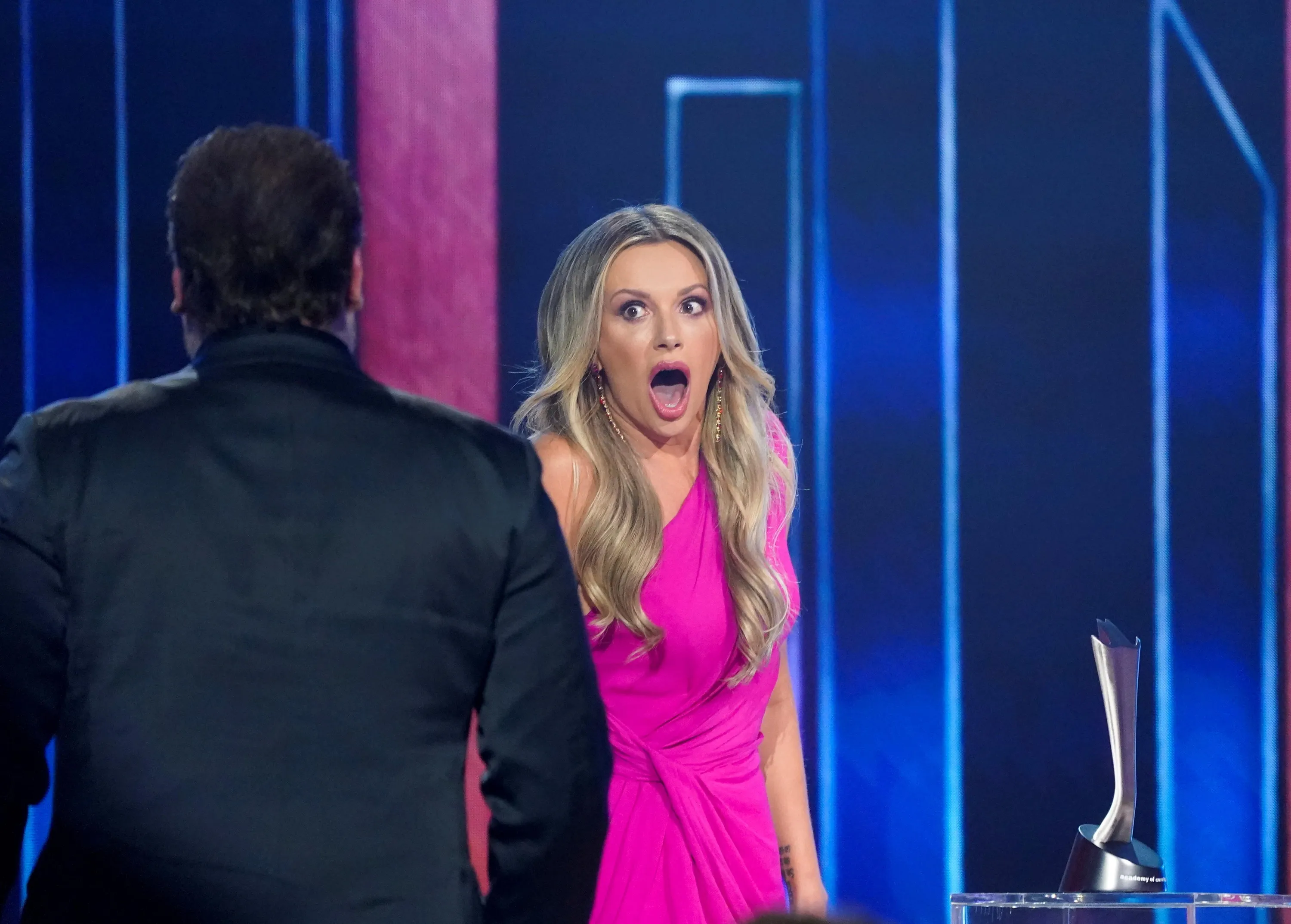 Single Of The Year winners for song “I Hope You're Happy Now” Carly Pearce and Lee Brice react at the 56th Academy of Country Music Awards (ACM) at the Grand Ole Opry in Nashville, Tennessee, U.S. April 18, 2021. (Photo by Harrison McClary/Reuters)