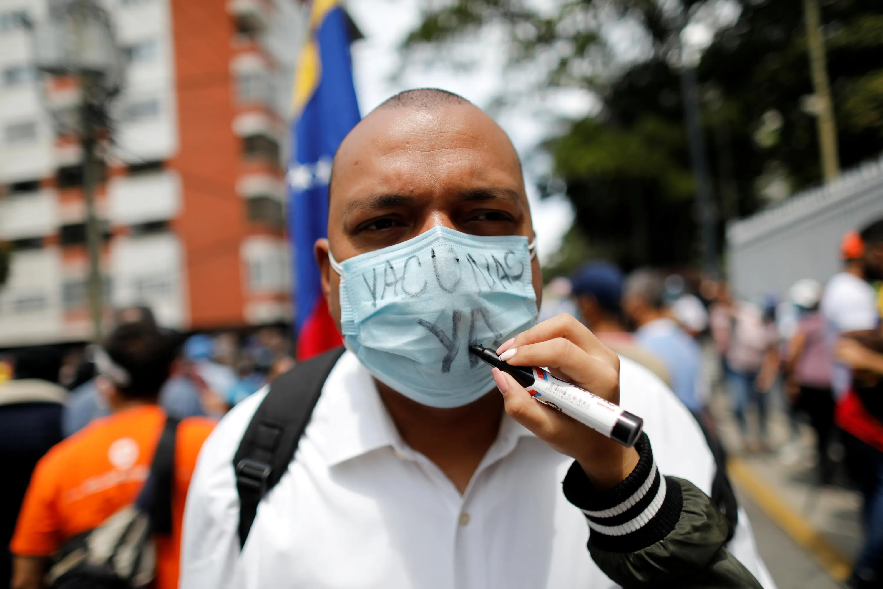 A person writes “Vaccines, now!” on the face mask of a healthcare worker during a protest to demand that all people get vaccinated against the coronavirus disease (COVID-19), in Caracas, Venezuela on April 17, 2021. (Photo by Leonardo Fernandez Viloria/Reuters)