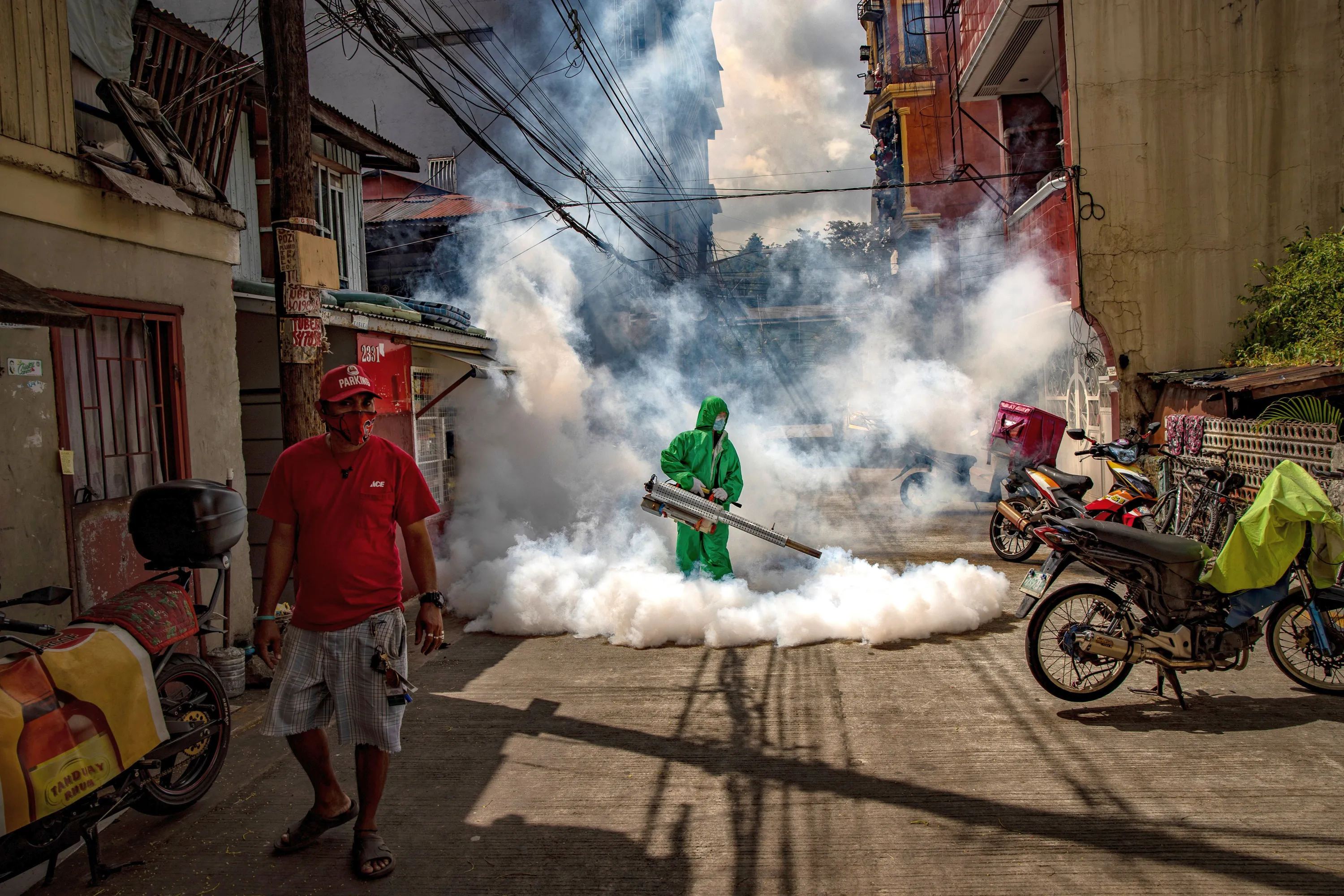 A worker wearing a hazmat suit uses a fogging machine to disinfect a street as preventive measure against COVID-19 on March 26, 2021 in Manila, Philippines. Curfews and stricter lockdowns are being implemented in several areas across the Philippines as the country experiences its worst surge in cases since the lockdown began more than a year ago. The country has reported more than 693,000 cases of COVID-19 so far, with at least 13,095 deaths. (Photo by Ezra Acayan/Getty Images)