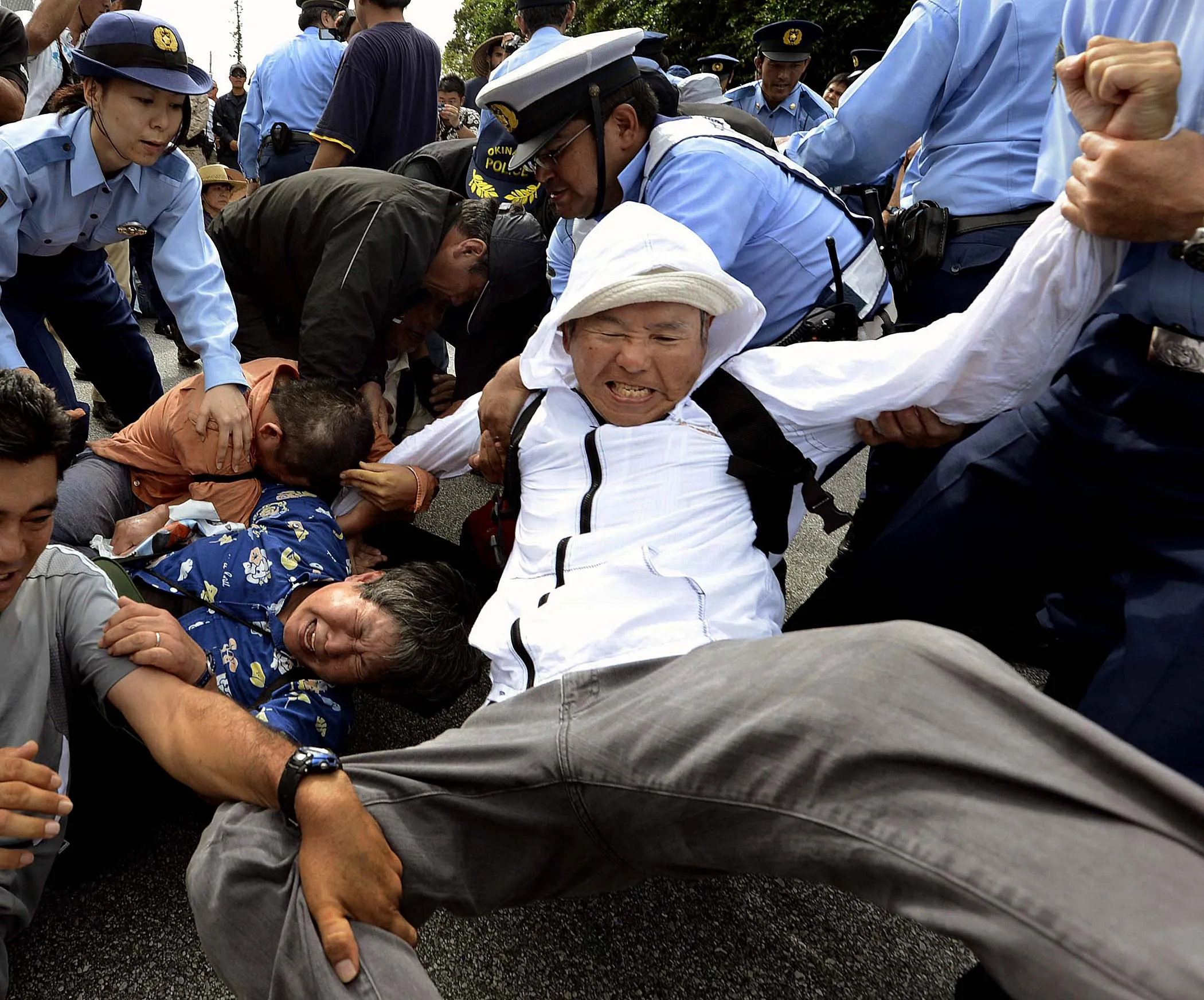 Police officers try to remove demonstrators who staged a sit-in against the planned deployment of Osprey aircraft, in front of a gate at Marine Corps Air Station Futenma in Ginowan City, Okinawa, Japan, on September 27, 2012. (Photo by Kyodo)