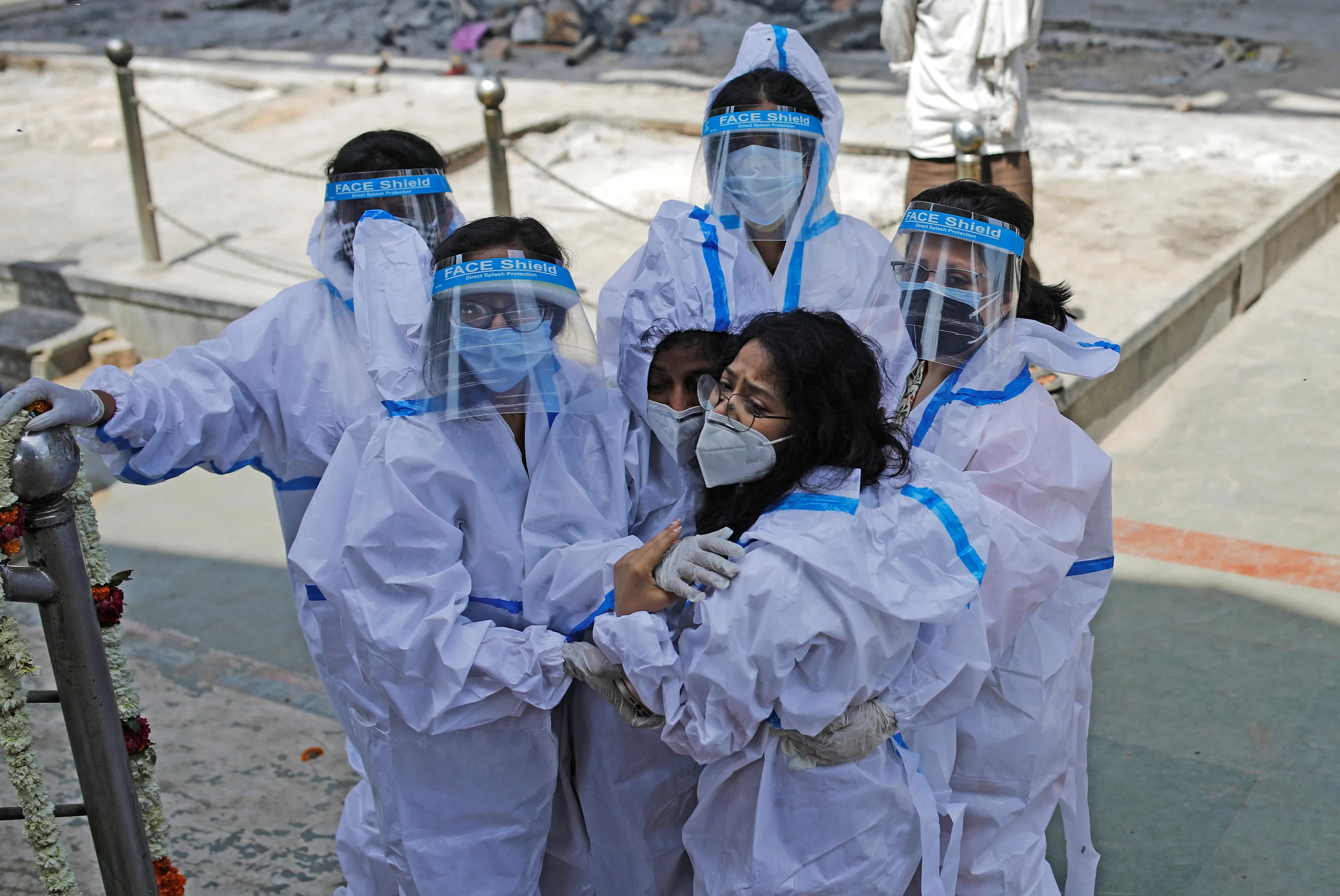 Relatives wearing personal protective equipment (PPE) mourn a man, who died from the coronavirus disease (COVID-19), at a crematorium in New Delhi, India on April 21, 2021. (Photo by Adnan Abidi/Reuters)