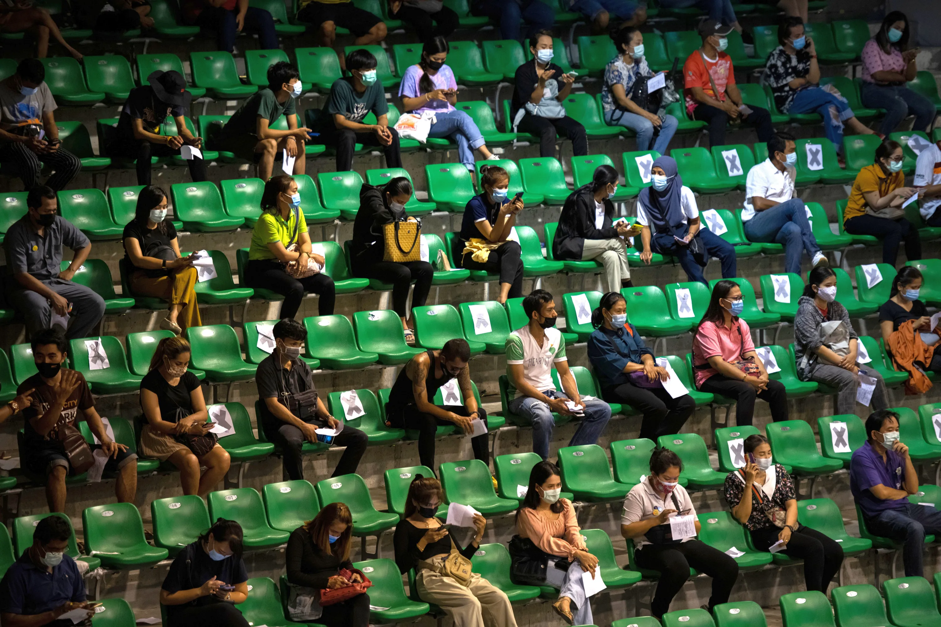 People take seats within a sport stadium while waiting to receive vaccination with the CoronaVac vaccine developed by Sinovac firm on April 22, 2021 in Phuket, Thailand. Thailand's tourism-driven economy has been battered by the country's borders being closed for a prolonged period, and a recent rise in Covid-19 cases has caused further concern as the government imposed fresh restrictions to control the outbreak. The country has lagged behind on the delivery of vaccines to the general population, a key step required to reopen the economy to tourism. (Photo by Sirachai Arunrugstichai/Getty Images)