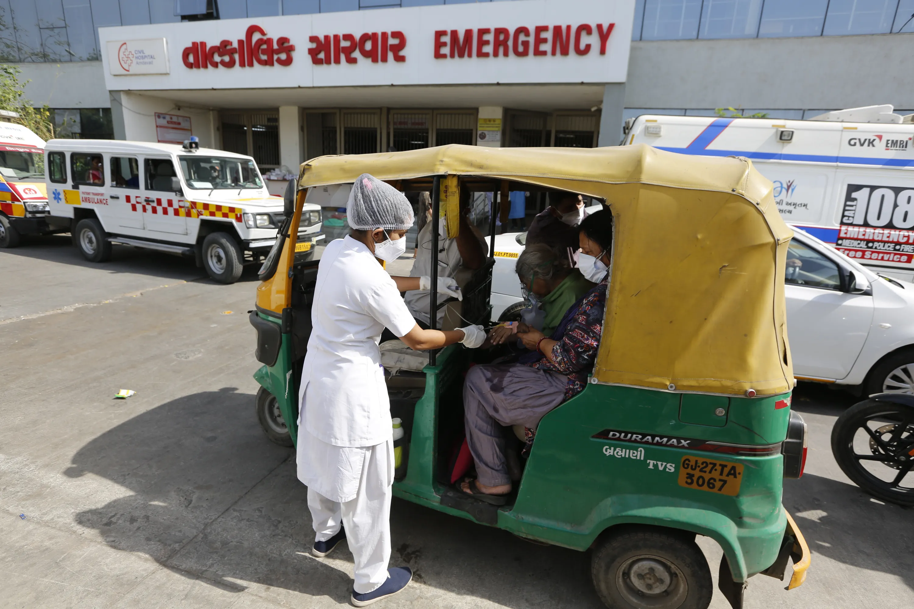 A COVID-19 patient attended by a health worker inside a vehicle at a dedicated COVID-19 government hospital in Ahmedabad, India, Thursday, April 22, 2021. A fire killed 13 COVID-19 patients in a hospital in western India early Friday as an extreme surge in coronavirus infections leaves the nation short of medical care and oxygen. India reported another global record in daily infections for a second straight day Friday, adding 332,730 new cases. The surge already has driven its fragile health systems to the breaking point with understaffed hospitals overflowing with patients and critically short of supplies. (Photo by Ajit Solanki/AP Photo)