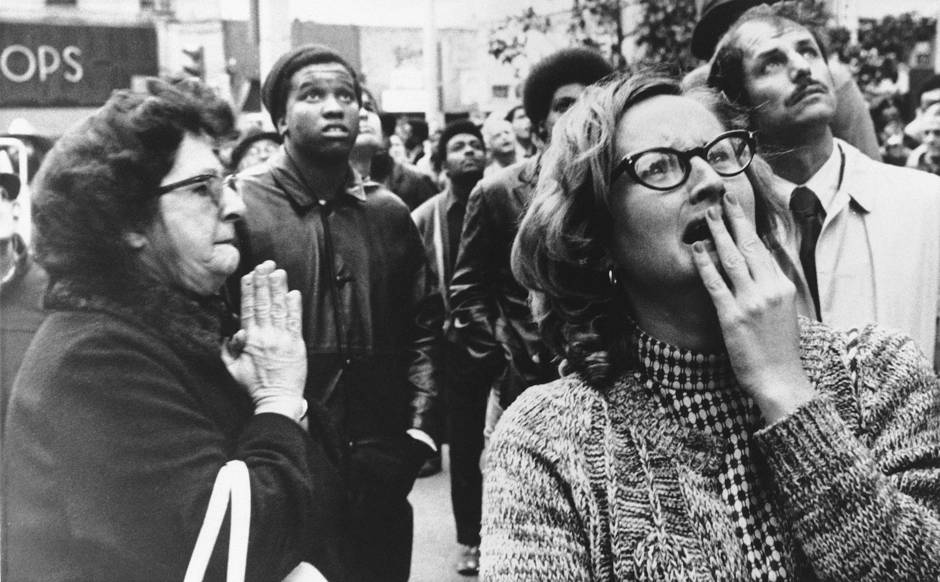 In a November 29, 1972 photo, spectators look up in disbelief as they watch four people leap to their death in downtown New Orleans. Fire broke out on the top floor of a 16-story Rault Tower building. (Photo by AP Photo)