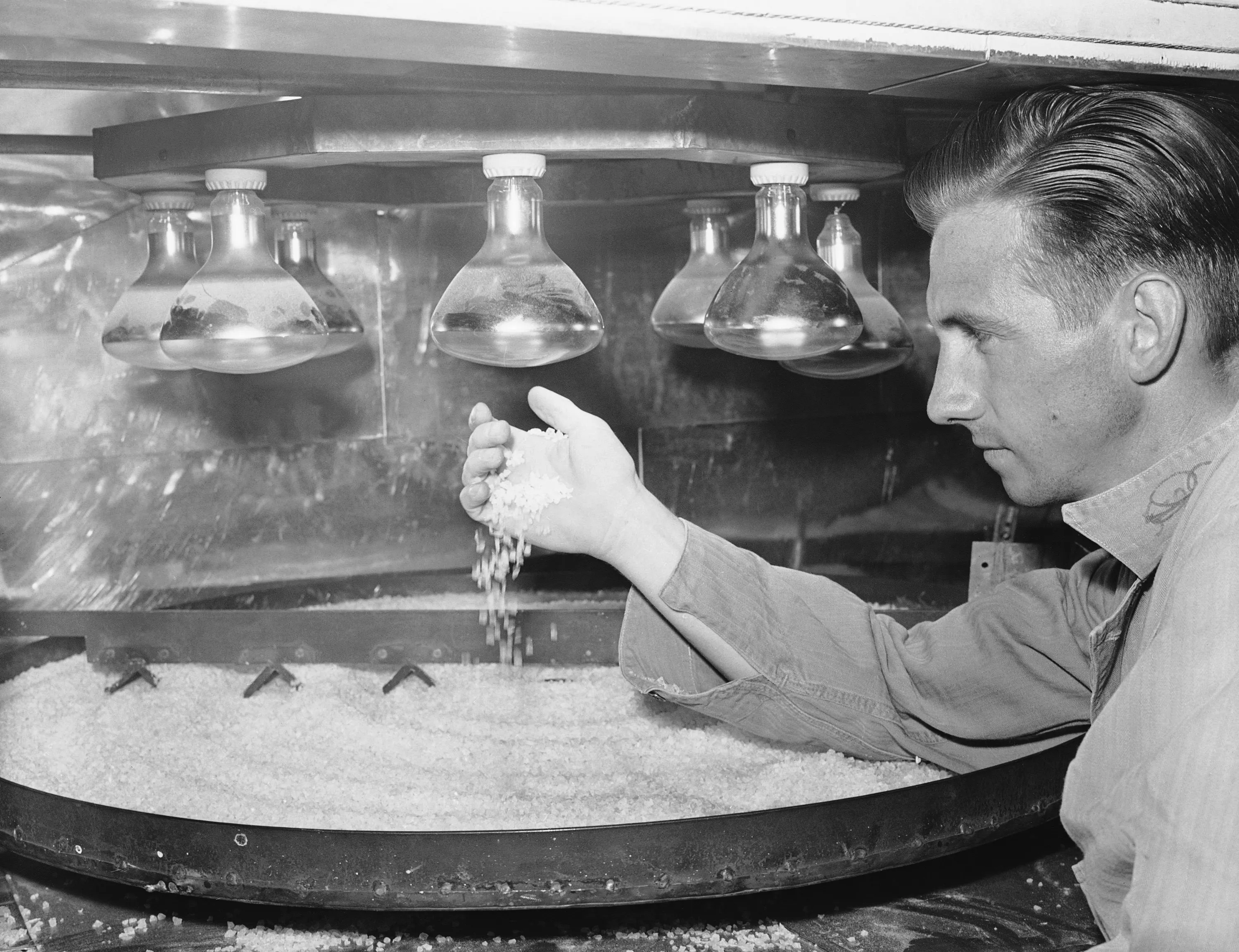 The making of shatter-proof lenses for eye guards is highly technical, involving the arts of physics and chemistry. This photo shows clears acrylic crystals from which the plastic lenses are made being baked in an infra-red oven to eliminate moisture and pre-condition them for the operation in the moulding press in Los Angeles September 15, 1942. The operator is Frank Hamilton. (Photo by AP Photo)