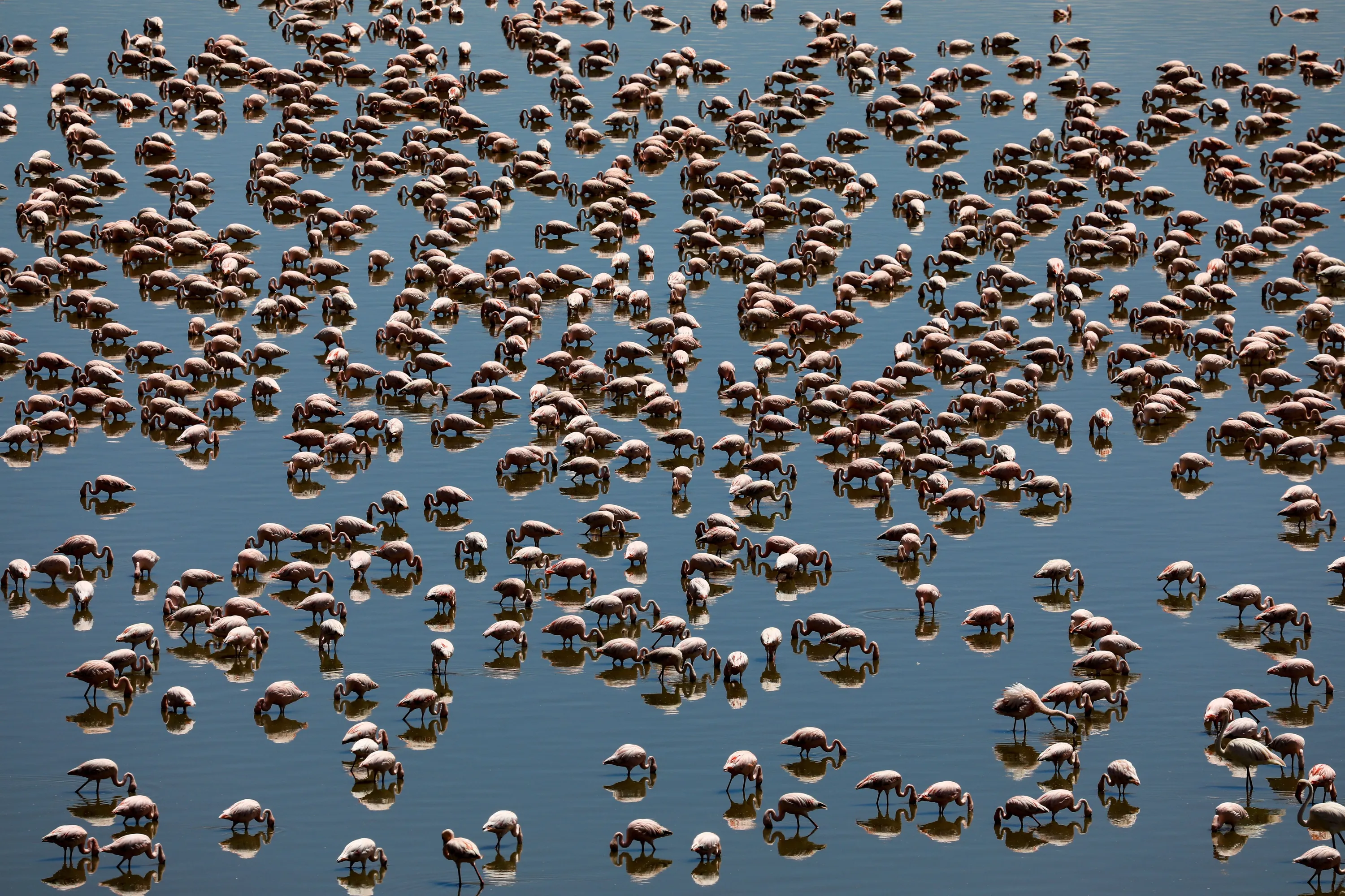 Flock of lesser flamingos are seen wading through the Lake Magadi, Great Rift Valley in Kajiado, Kenya, 11 April 2021. According to community tourist guides at the lake, power lines supplying power to a chemical factory stationed at the lake has turned to death traps for migratory birds mainly flamingos. Tens of flamingos have been killed in the couple of weeks. They have been advocating for the power lines to be fitted with more bird diverters which are meant to distract the birds from the lines. Lake Magadi has been receiving a huge number of migratory flamingos migrating from lake Nakuru due to the high-water levels and contamination at lake Nakuru where there has been reported increase cases of flamingos deaths from suspected toxins inthe contaminated lake. (Photo by Daniel Irungu/EPA/EFE)