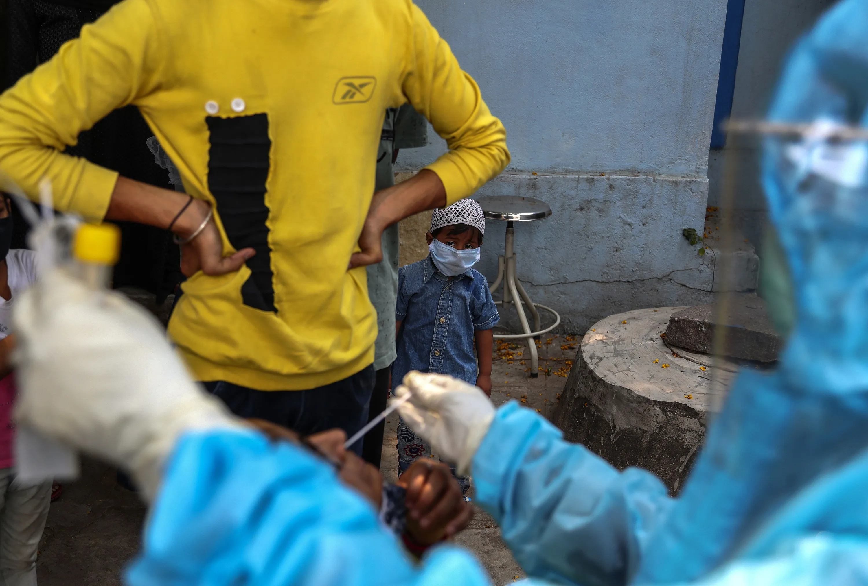 A child wearing a mask as a precaution against the coronavirus watches as a health worker takes a nasal swab sample of a woman to test for COVID-19 at a hospital in Hyderabad, India, Monday, April 19, 2021. (Photo by Mahesh Kumar A./AP Photo)