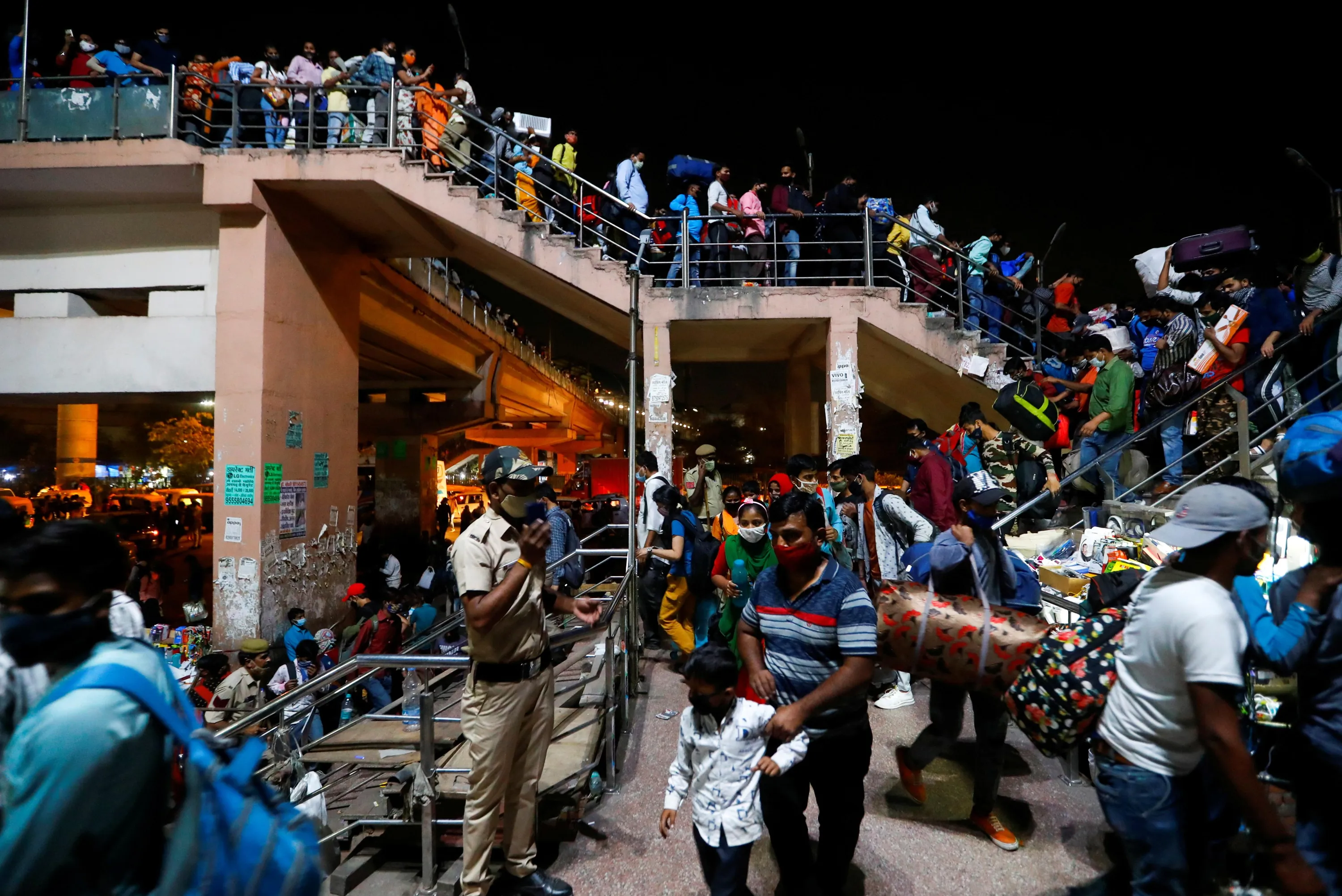 Migrant workers arrive at a bus station to board buses to return to their villages after Delhi government ordered a six-day lockdown to limit the spread of the coronavirus disease (COVID-19), in Ghaziabad on the outskirts of New Delhi, India, April 19, 2021. (Photo by Adnan Abidi/Reuters)