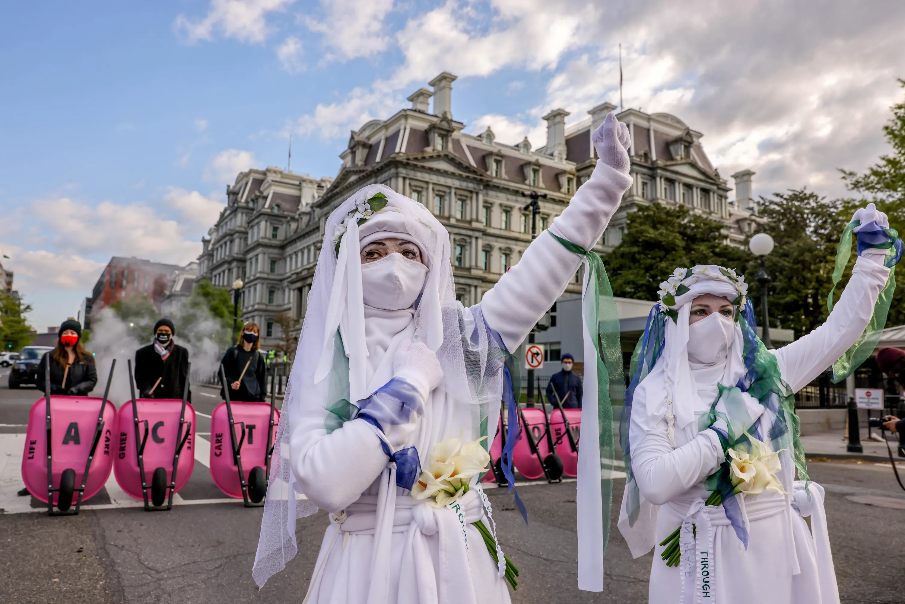 The White Rebels and Extinction Rebellion DC block 17th Street after dumping cow manure outside the White House on Earth Day to protest President Biden's climate plan in Washington, U.S., April 22, 2021. (Photo by Evelyn Hockstein/Reuters)
