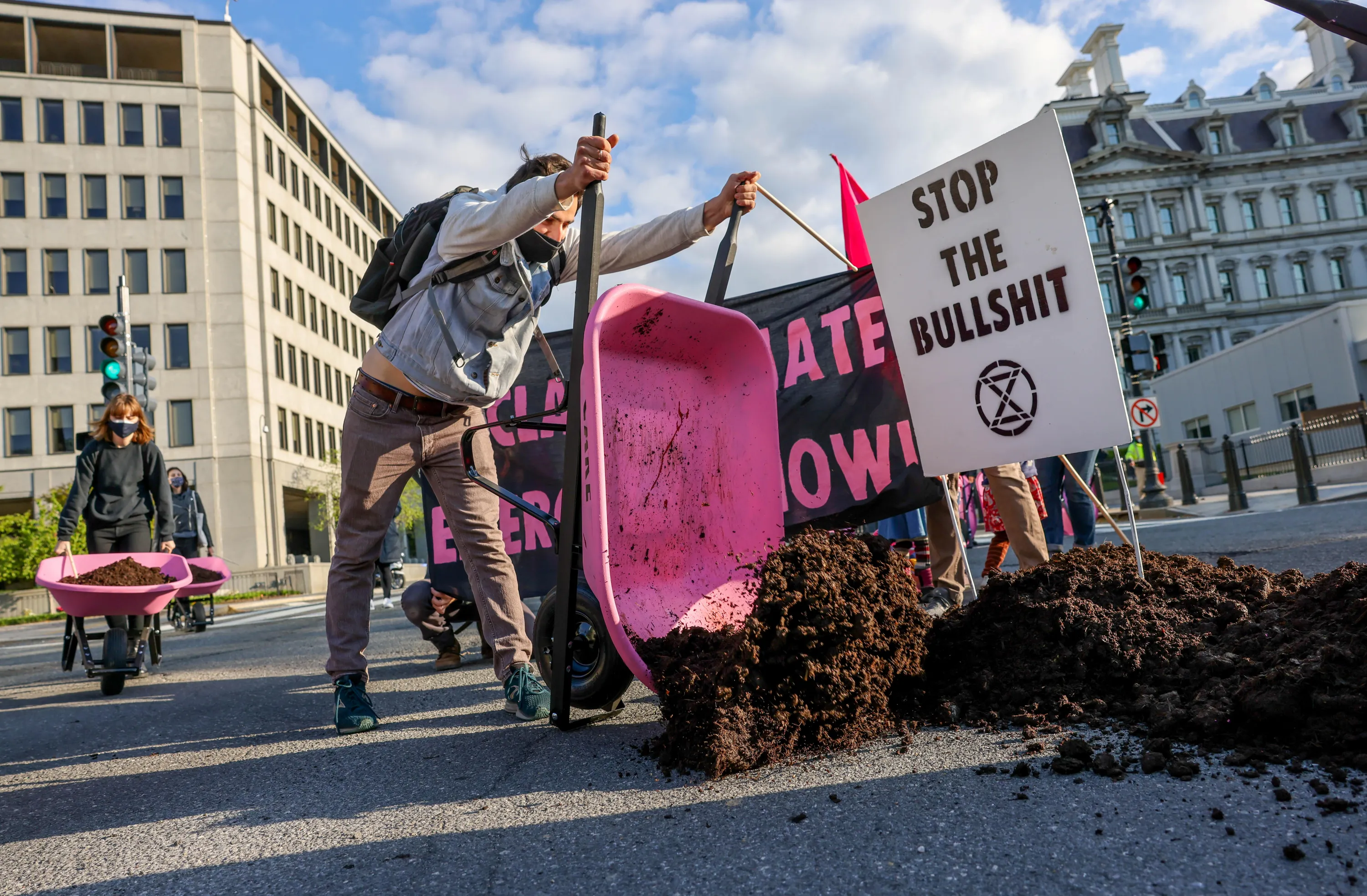 Extinction Rebellion DC dumps cow manure at the entrance to the White House on Earth Day to protest President Biden's climate plan in Washington, U.S., April 22, 2021. (Photo by Evelyn Hockstein/Reuters)