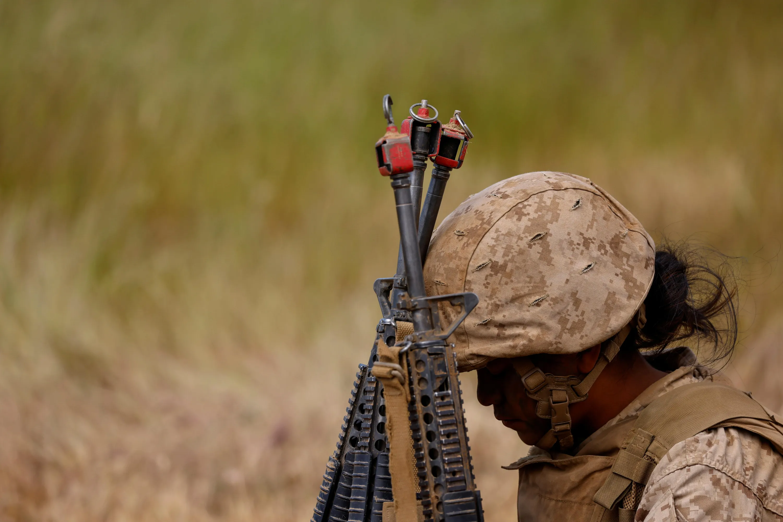 A female recruit from U.S. Marine Corps Recruit Depot San Diego rests during the grueling crucible training as their platoon breaks a barrier becoming the first ever women Marines trained at Camp Pendleton, California, U.S., April 21, 2021. (Photo by Mike Blake/Reuters)