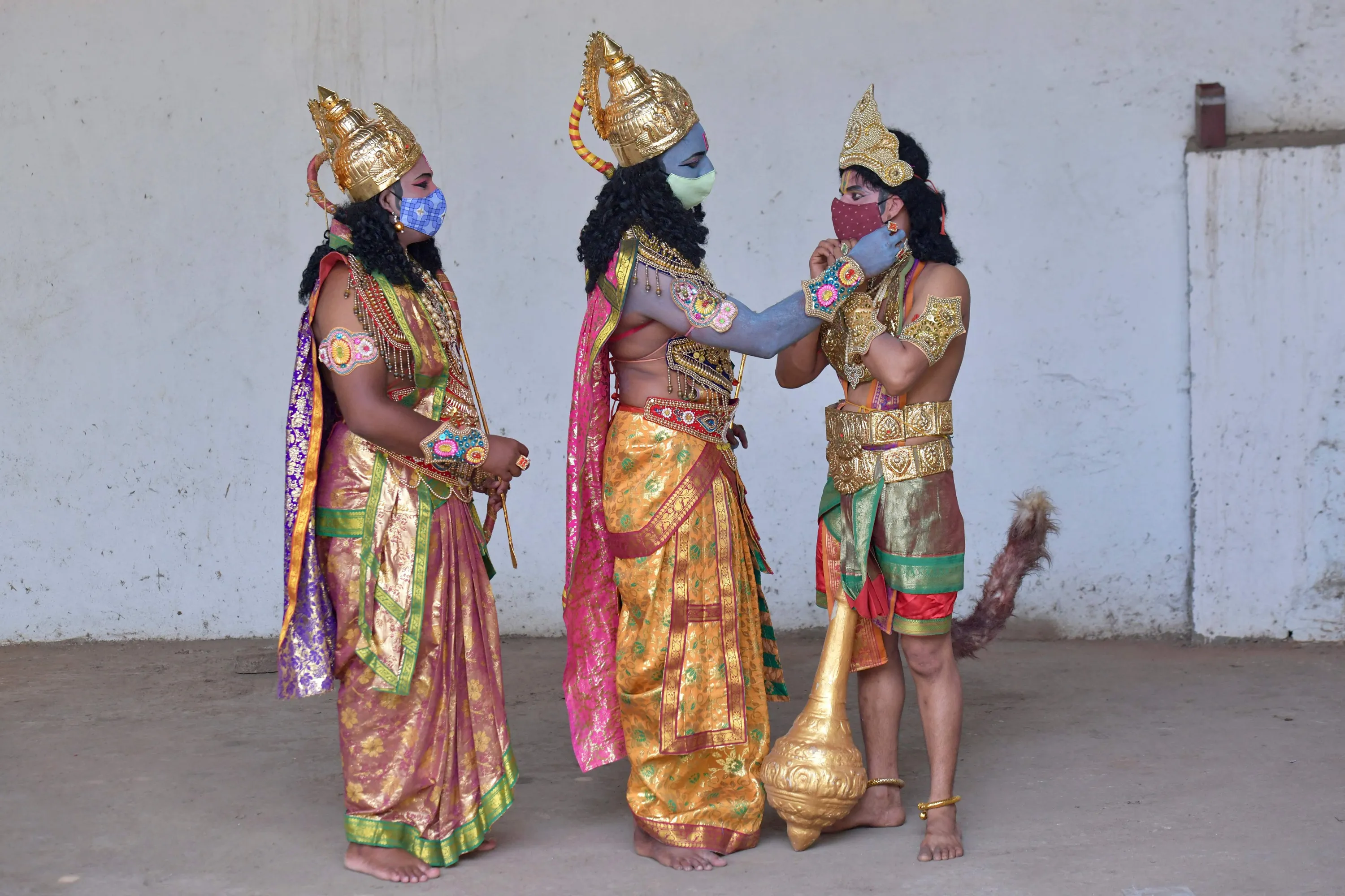 Men dressed as Hindu deities from the epic Ramayan wear face masks before going on a public awareness campaign against the spread of the Covid-19 coronavirus, on the occasion of the Hindu festival “Ram Navami”, in Bangalore on April 21, 2021. (Photo by Manjunath Kiran/AFP Photo)