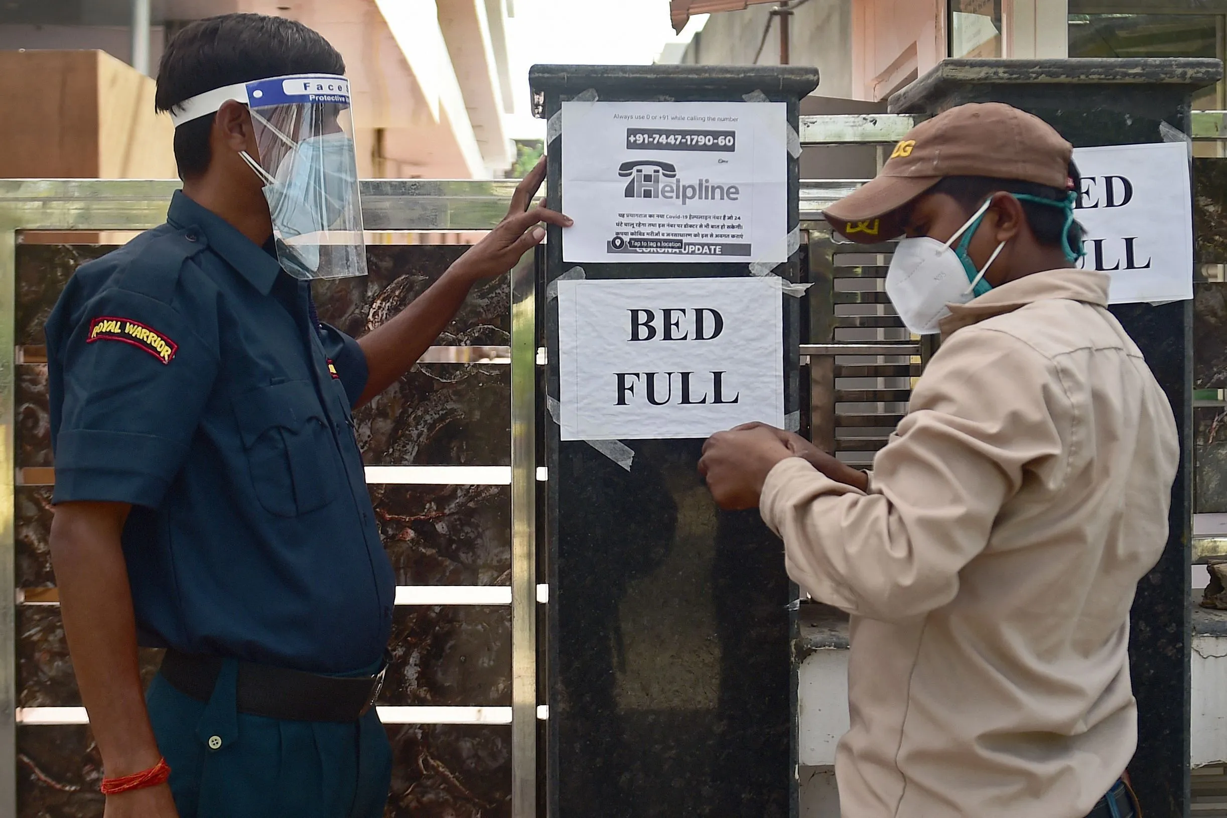 A security guard puts up a notice informing the non-availability of beds for patients in a private hospital amid Covid-19 coronavirus pandemic in Allahabad on April 22, 2021. (Photo by Sanjay Kanojia/AFP Photo)