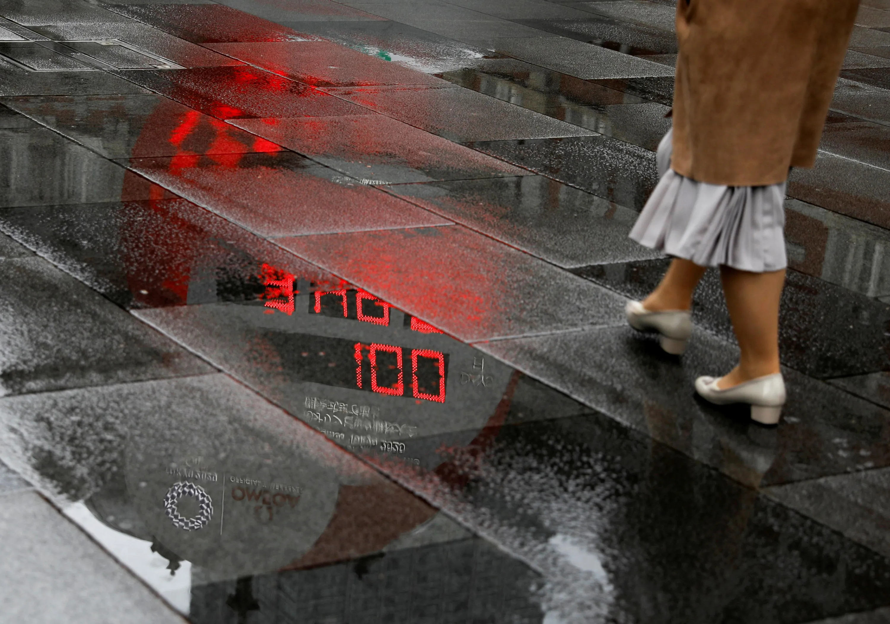 A countdown clock showing that 100 days are left until Tokyo 2020 Olympic Games that have been postponed to 2021 due to the coronavirus disease (COVID-19) pandemic is reflected in a puddle in Tokyo, Japan, April 14, 2021. (Photo by Issei Kato/Reuters)