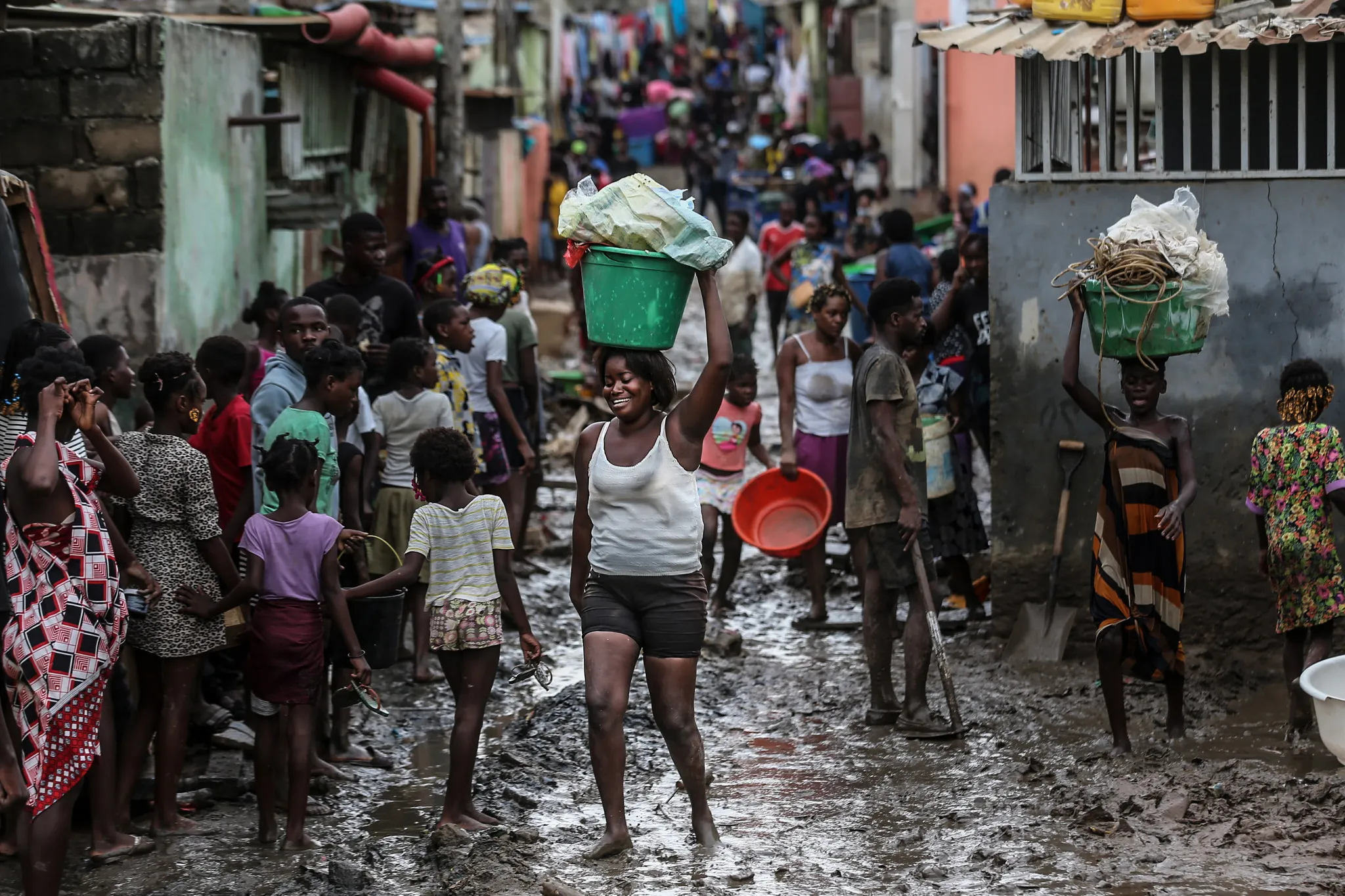 People on a muddy street after heavy rain that fell Monday night in Encide neighborhood, in the Sambizanga district, on the outskirts of Luanda, Angola, 20 April 2021. The torrential rains that hit Luanda on 19 April killed 14 people and left 8,000 displaced, with 16 houses collapsed, 15 trees fell, and a bridge was destroyed, among other damages yet to be calculated. (Photo by Ampe Rogerio/EPA/EFE)