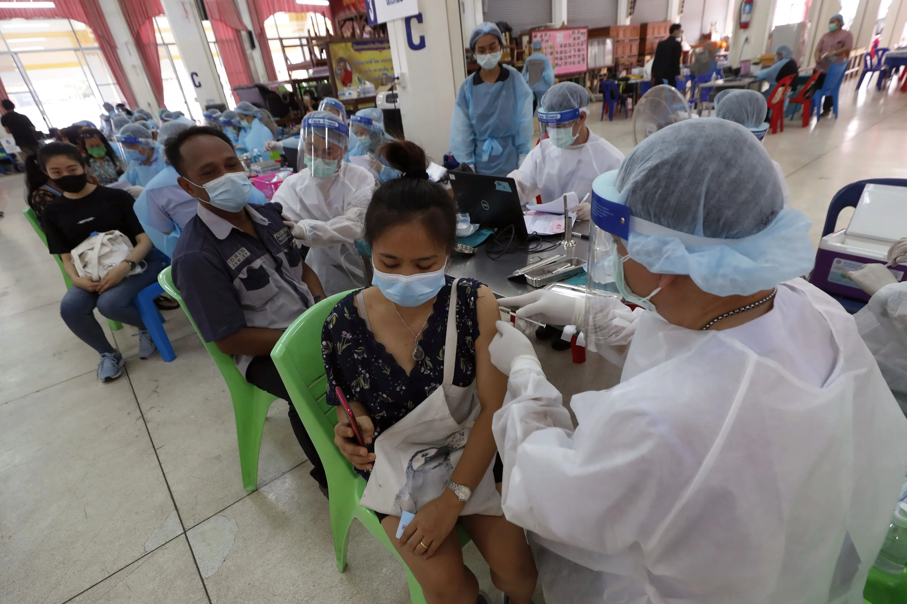 Health workers inject a dose of the Sinovac COVID-19 vaccine for people in Bangkok, Thailand, Monday, April 12, 2021. Thailand's Health Ministry warned Sunday that restrictions may need to be tightened to slow the spread of a fresh coronavirus wave, as the country hit a daily record for new cases. (Photo by Sakchai Lalit/AP Photo)