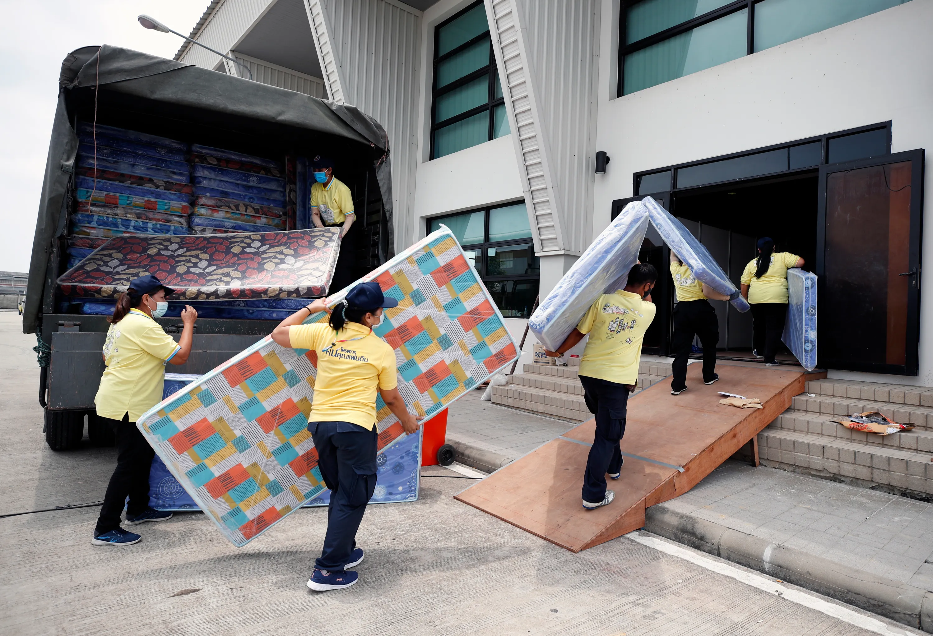 Workers carry mattresses prepared as beds for patients amid the surge of COVID-19 coronavirus pandemic at a field hospital sat up in a gymnasium in Bang Bon district on the outskirts of Bangkok, Thailand, 12 April 2021. Thai authorities are setting up 10,000 field hospital beds in the capital of Bangkok due to the medical facilities bed shortage for coronavirus patients after the rapid surging of COVID-19 coronavirus pandemic infections caused by UK variant strain of the virus. (Photo by Rungroj Yongrit/EPA/EFE)