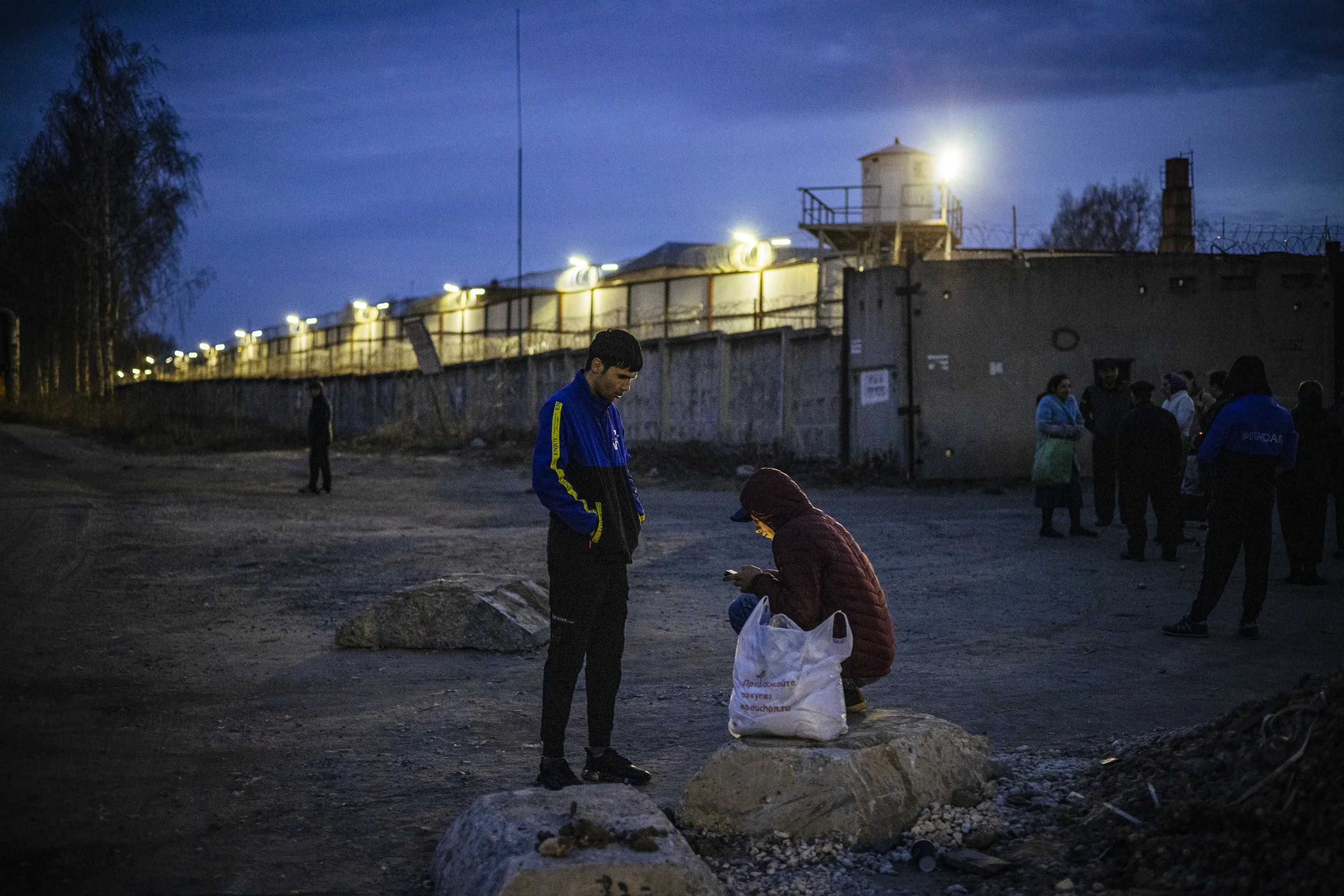 Migrant workers stand by the barbed wire fence of the IK-3 penal colony where jailed Kremlin critic Alexei Navalny was reportedly transferred in the city of Vladimir on April 19, 2021. Russia's penitentiary service said on April 19, 2021, it was transferring ailing Kremlin critic Alexei Navalny to a prison hospital, as the EU warned it would hold Moscow responsible for the state of his health. The United States on Sunday threatened Russia with “consequences” if President Vladimir Putin's major domestic opponent – who launched a hunger strike three weeks ago – dies in jail, with Navalny's private doctors warning at the weekend he could pass away at “any minute”. (Photo by Dimitar Dilkoff/AFP Photo)