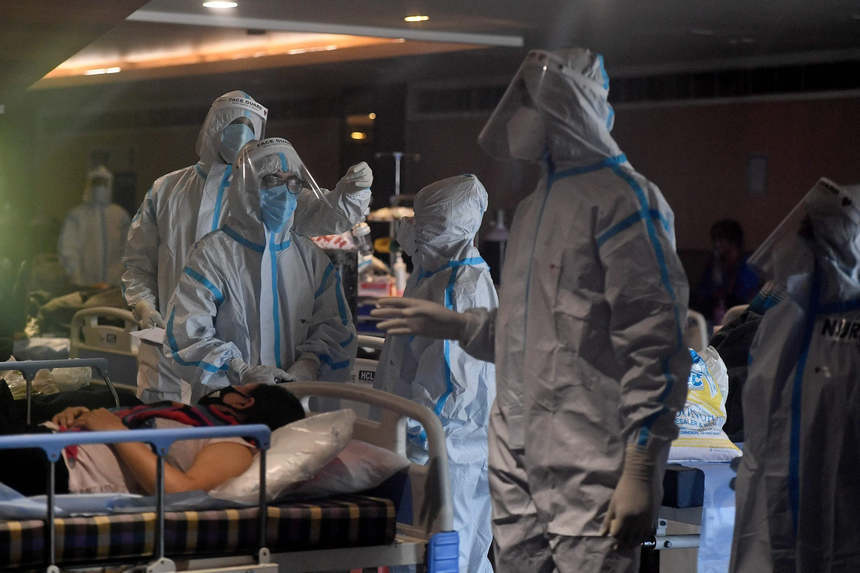 Health workers wearing personal protective equipment (PPE kit) attends to Covid-19 coronavirus positive patients inside a banquet hall temporarily converted into a covid care centre in New Delhi on April 29, 2021. (Photo by Tauseef Mustafa/AFP Photo)