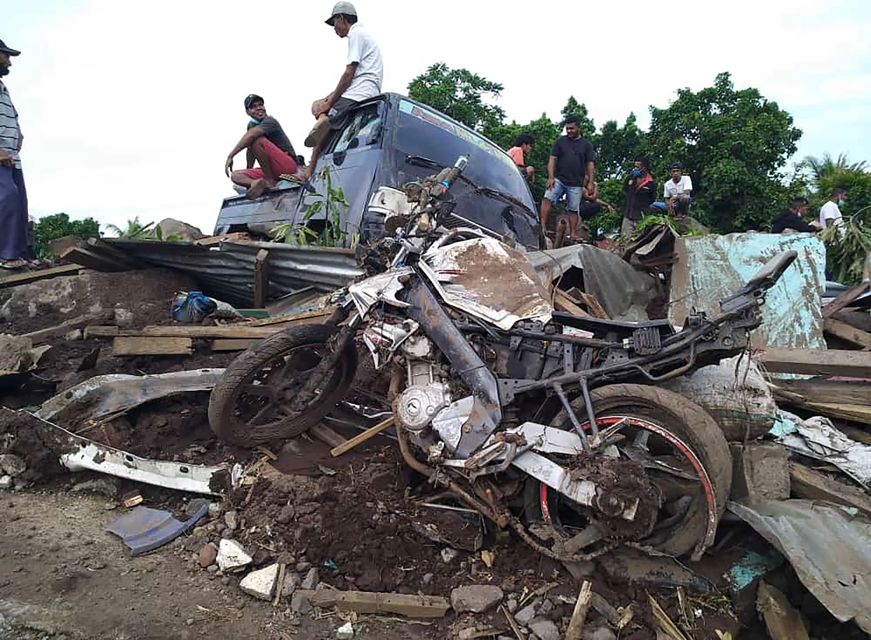 People sit on the wreckage of a truck at a flood-affected village in Nalelamadiken on Adonara Island, East Nusa Tenggara province, Indonesia, Wednesday, April 7, 2021. Multiple disasters triggered by Tropical Cyclone Seroja in eastern Indonesia and neighboring East Timor have left a number of people dead or missing. (Photo by Rofinus Monteiro/AP Photo)