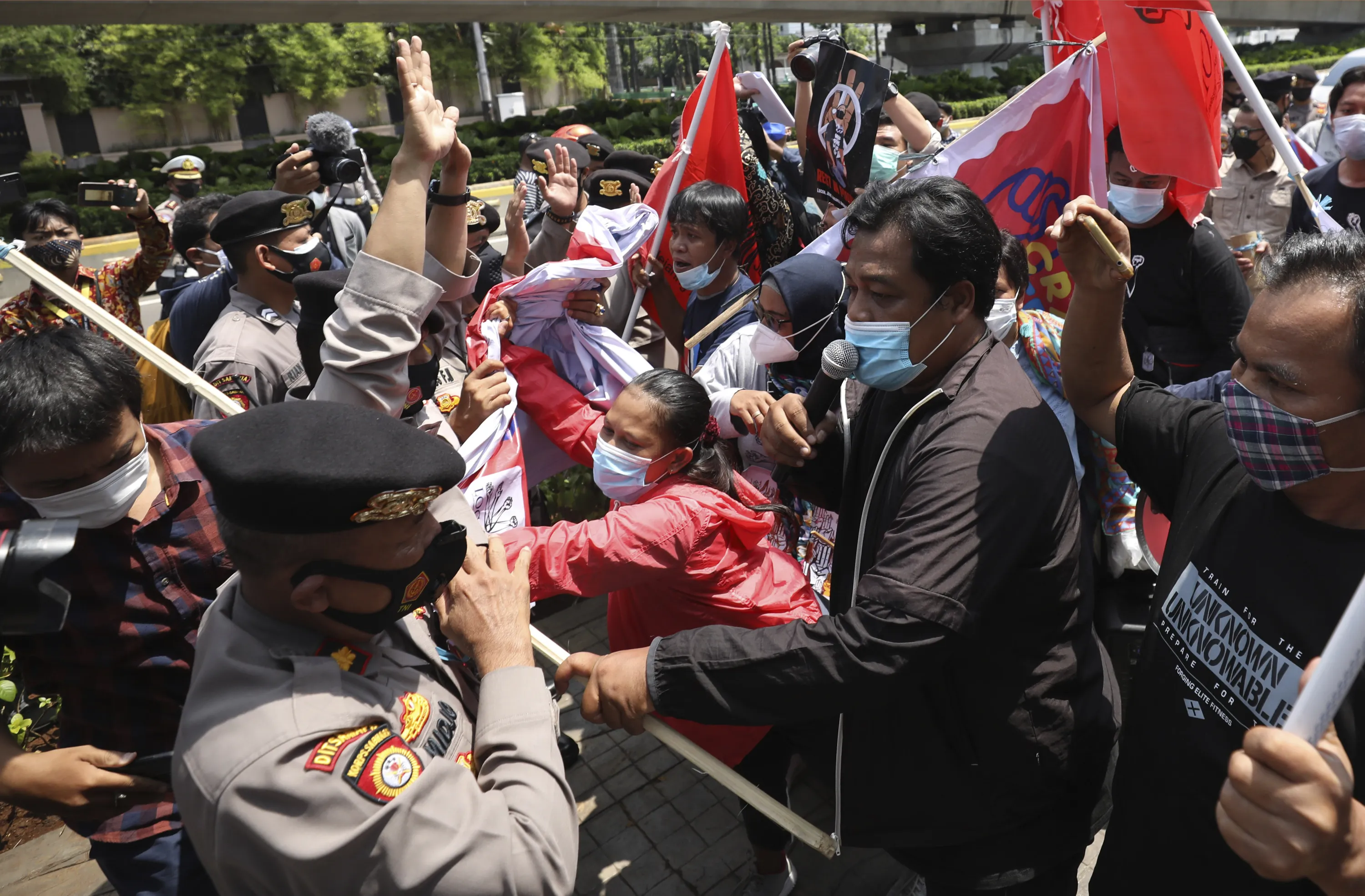 Activists scuffle with police officers as they are dispersed during a rally against Myanmar's military coup near the Association of Southeast Asian Nations (ASEAN) Secretariat ahead of a leaders' meeting in Jakarta, Indonesia, Saturday, April 24, 2021. Southeast Asian leaders are to meet Myanmar's top general and coup leader in an emergency summit in Indonesia Saturday, and are expected to press calls for an end to violence by security forces that has left hundreds of protesters dead as well as the release of Aung San Suu Kyi and other political detainees. (Photo by Dita Alangkara/AP Photo)